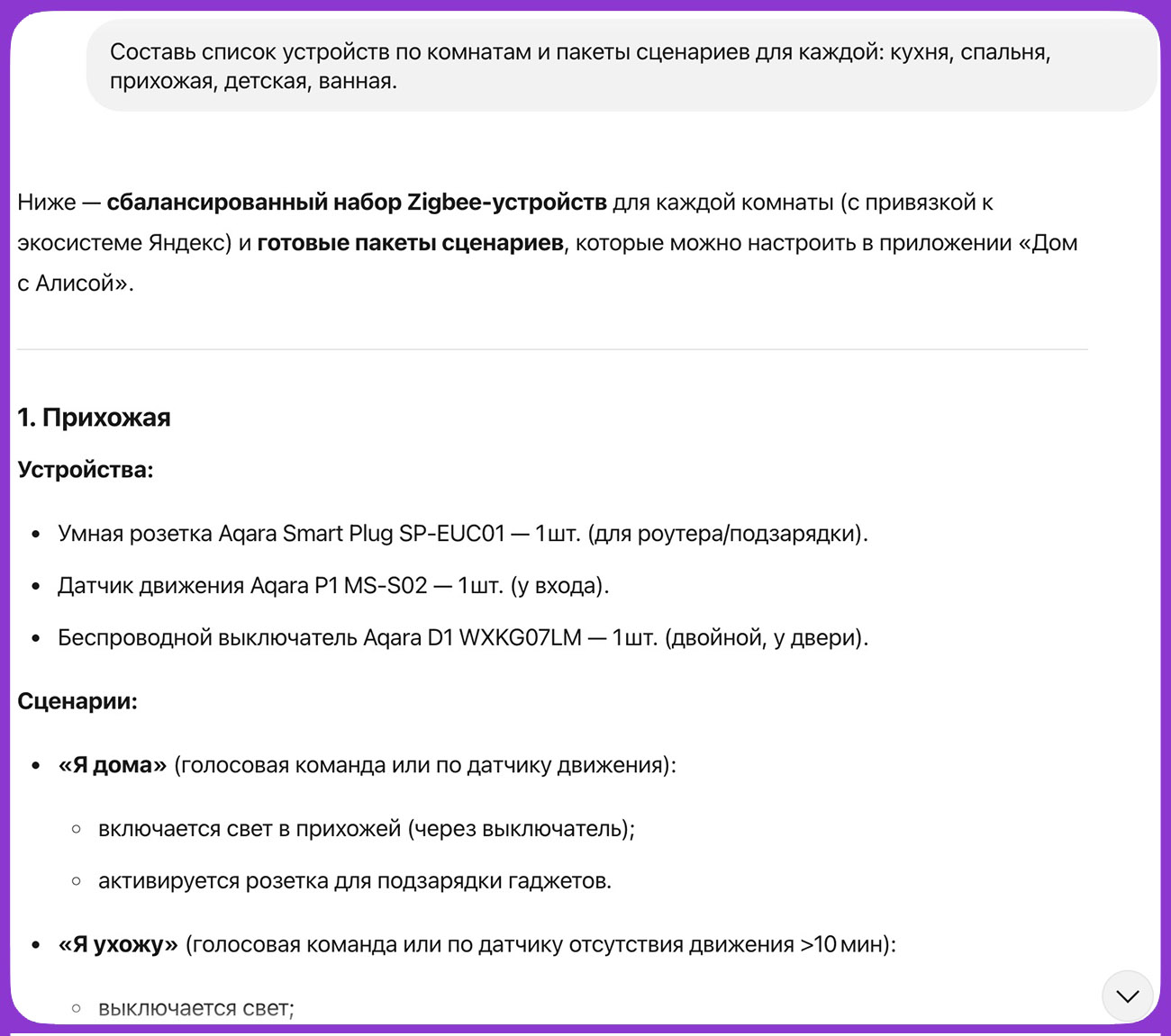 📍Промпт: Составь список устройств по комнатам и пакеты сценариев для каждой: кухня, спальня, прихожая, детская, ванная.