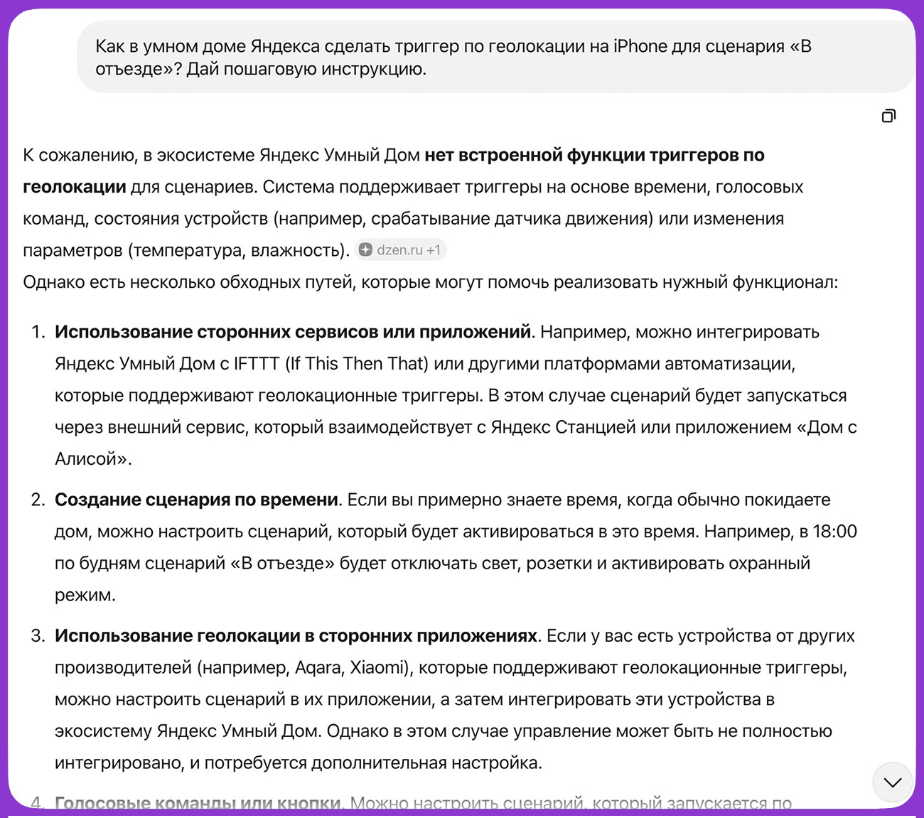 В сухом остатке Алиса сработала как организатор проекта умного дома. Сначала спросила нужное, затем дала список железа под Zigbee, добила смету по местам, расписала сценарии и честно объяснила, как обойти отсутствие геотриггеров на iPhone.