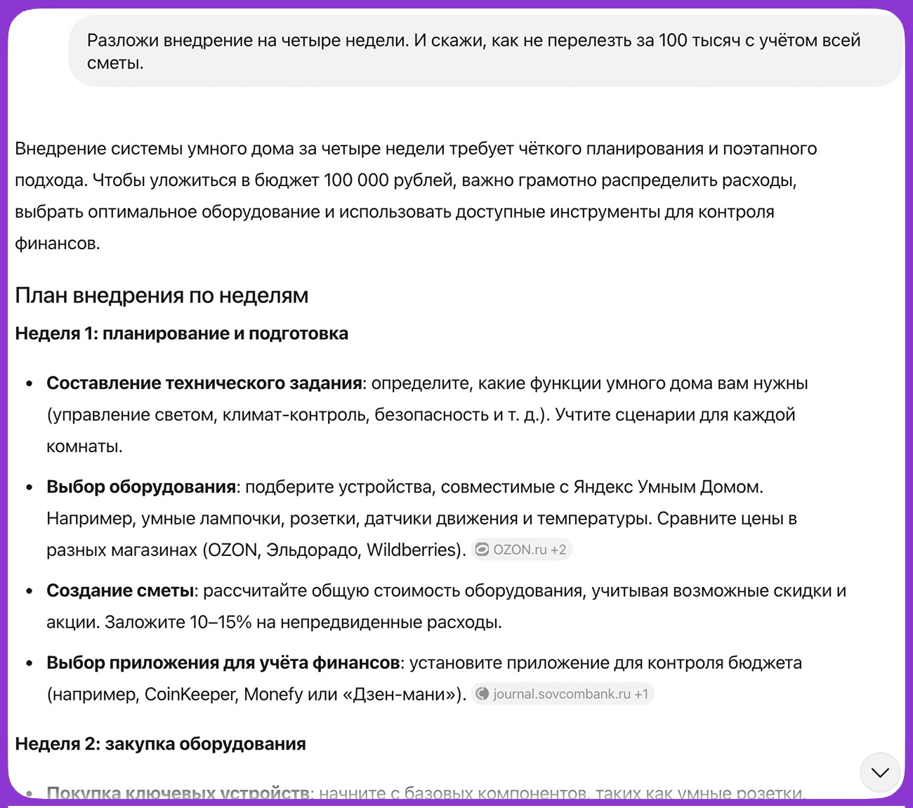 📍Промпт: Разложи внедрение на четыре недели. И скажи, как не перелезть за 100 тысяч с учётом всей сметы.