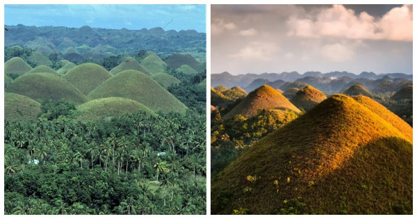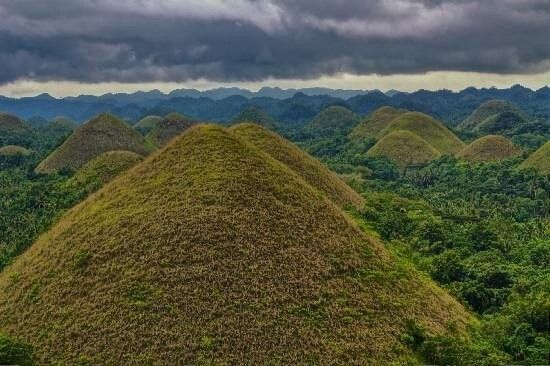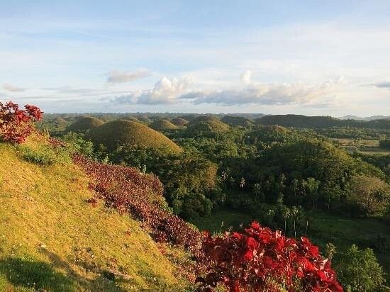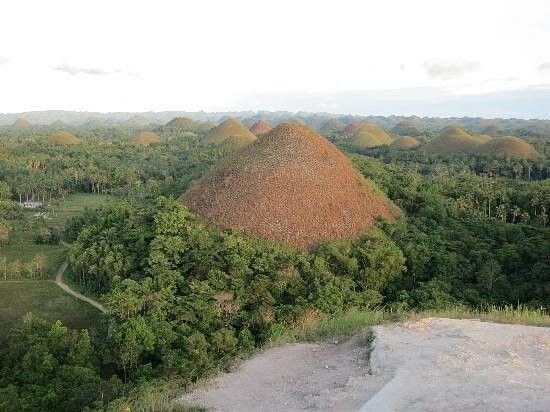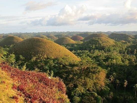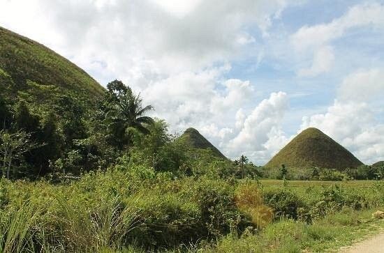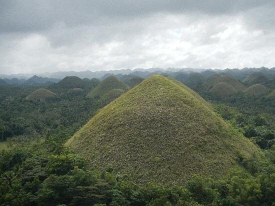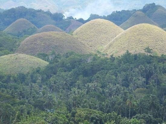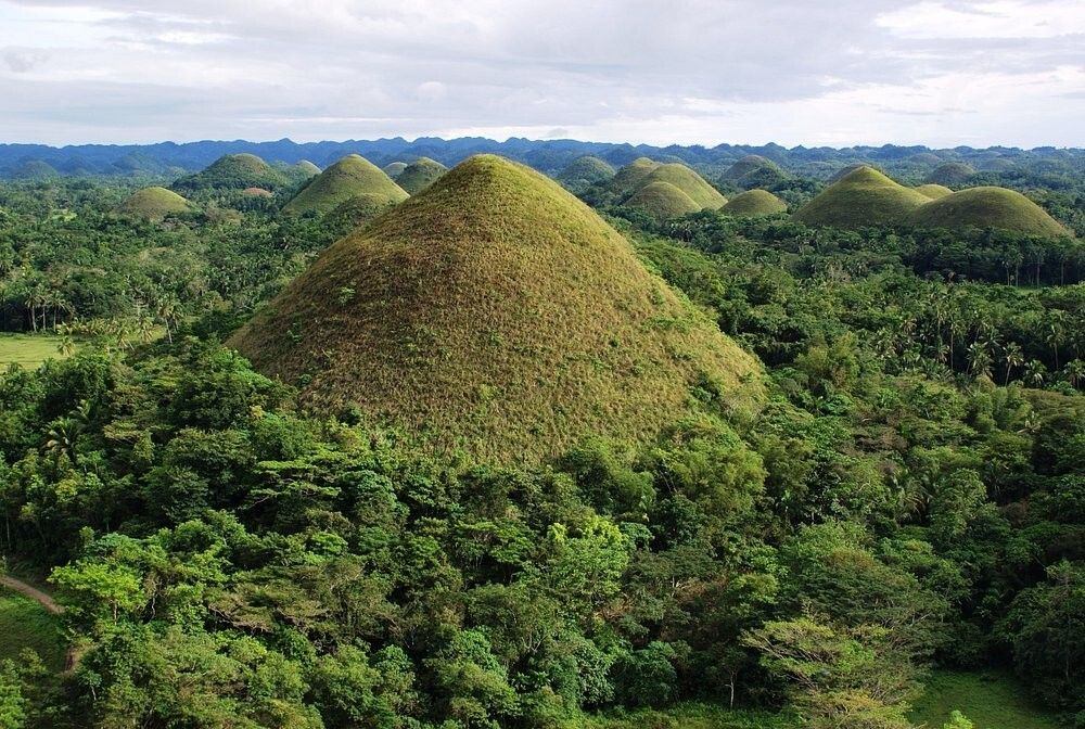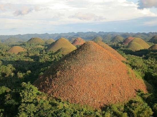 Здесь их около 1260 штук, разбросанных по территории в 50 квадратных километров. Их высота - от 30 до 50 метров, и они удивительно симметричны. Холмы состоят из покрытого травой известняка и свой фирменный шоколадный оттенок приобретают, когда зелень выгорает под палящим солнцем.