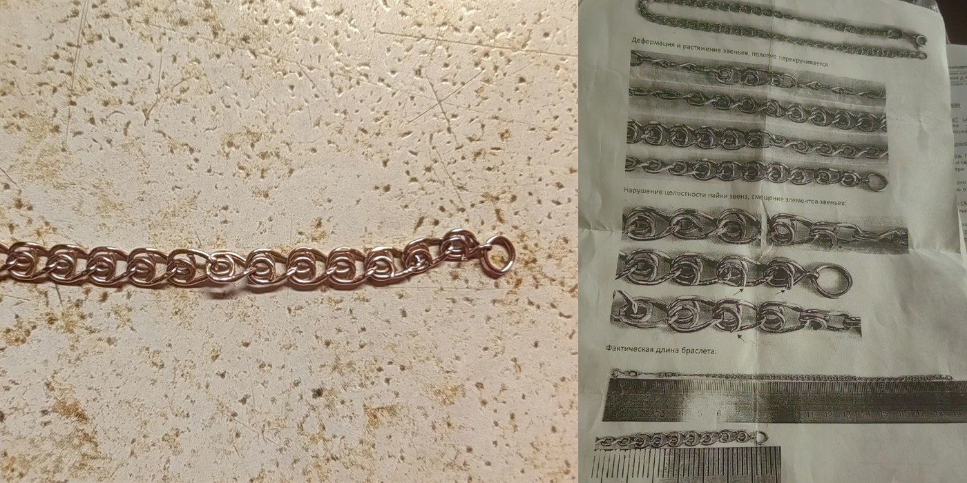 Экспертизу выполнял изготовитель — ювелирный завод «Зорка». Проверка была проведена 3 октября. В акте указано, что при внешнем осмотре на браслете обнаружены: