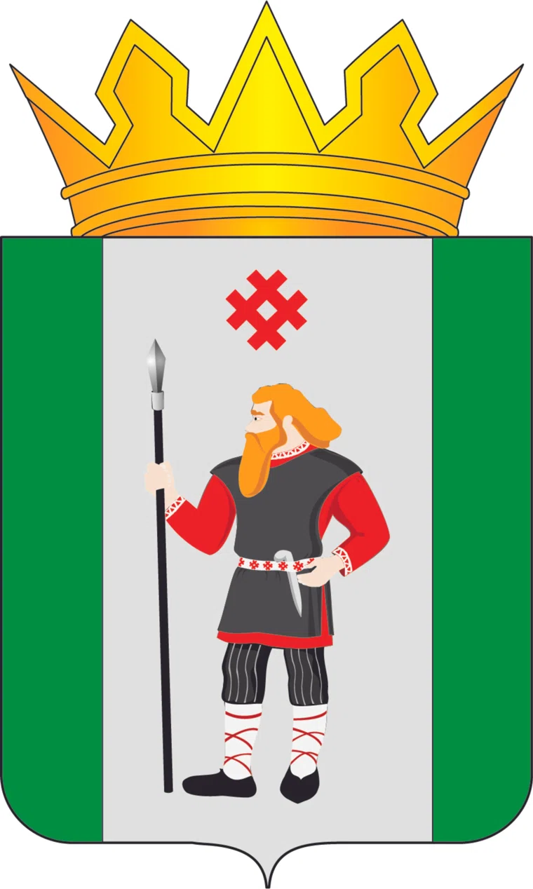 На гербе Кудымкара, как и всего округа, ранее был изображен идущий медведь, являющийся олицетворением спокойствия и миролюбивого добрососедства и движения вперед. Медведь — один из распространенных героев персонажей коми-пермяцкого эпоса. Но после назад герб поменяли на … охотника, в том числе и на медведей. Бородатый коми-пермяк указывает на историческое прошлое территории, заселенной народом коми-пермяков, одним из основных занятий которых была охота. Со старого герба перекочевала «перна» (звезда) — элемент орнаментального мотива, наиболее характерного для прикладного искусства коми-пермяков. Национальный символ служит эмблемой древности происхождения, вечности, высоких стремлений и счастья. Она изображалась на многих оберегах и до сих пор является частью национального орнамента.