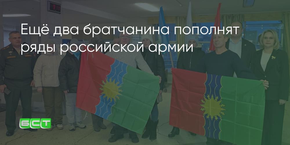 Ещё двое братчанин встали на защиту Родины. Добровольцев провожали в здании администрации. Им передали флаги и шевроны с гербом города. В Шелехове мужчины пройдут медкомиссию и подпишут контракт с Минобороны, после их распределят по воинским частям.