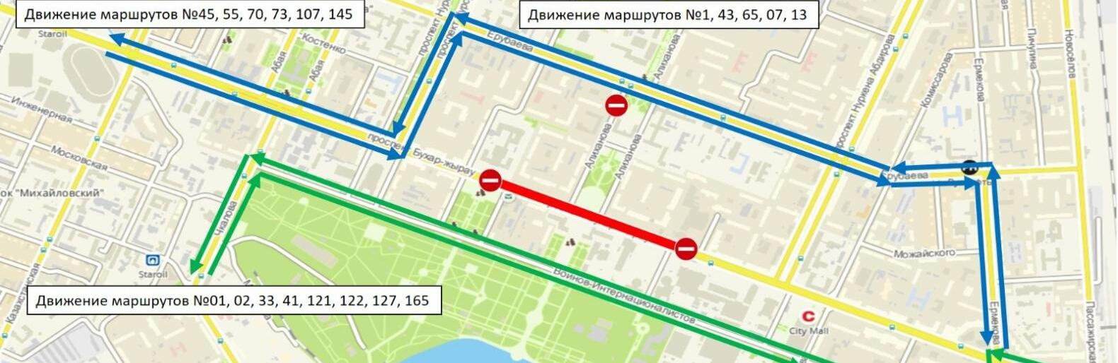 Общественный транспорт на это время направят по временной схеме. В акимате рекомендуют горожанам заранее планировать маршрут и при необходимости выбирать альтернативные пути движения.