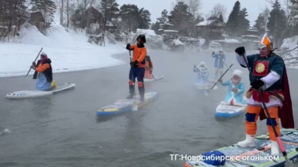 Участники заплыва облачились в праздничные костюмы. Среди них были Снегурочки, Богатырки, сказочные животные. Все они, кроме участника в костюме полосатого кота, успешно преодолели маршрут. А вот котику не повезло — он свалился в воду.