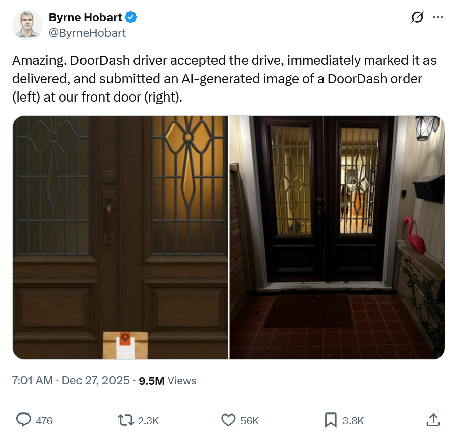 Писатель Бирн Хобарт столкнулся с необычным случаем мошенничества в сервисе доставки еды DoorDash. Курьер принял заказ, немедленно отметил его как доставленный и прикрепил созданное ИИ изображение якобы оставленного у двери заказа. На фейковом снимке виден пакет DoorDash у входной двери, которая приблизительно похожа на реальную дверь дома Хобарта, но детали явно сгенерированы нейросетью.