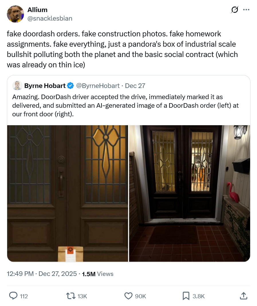 Фейковые заказы DoorDash. Фейковые фото строительства. Фейковые домашние задания. Фейковое все – просто ящик Пандоры промышленного масштаба, загрязняющий как планету, так и базовый общественный договор, который и так висел на волоске.