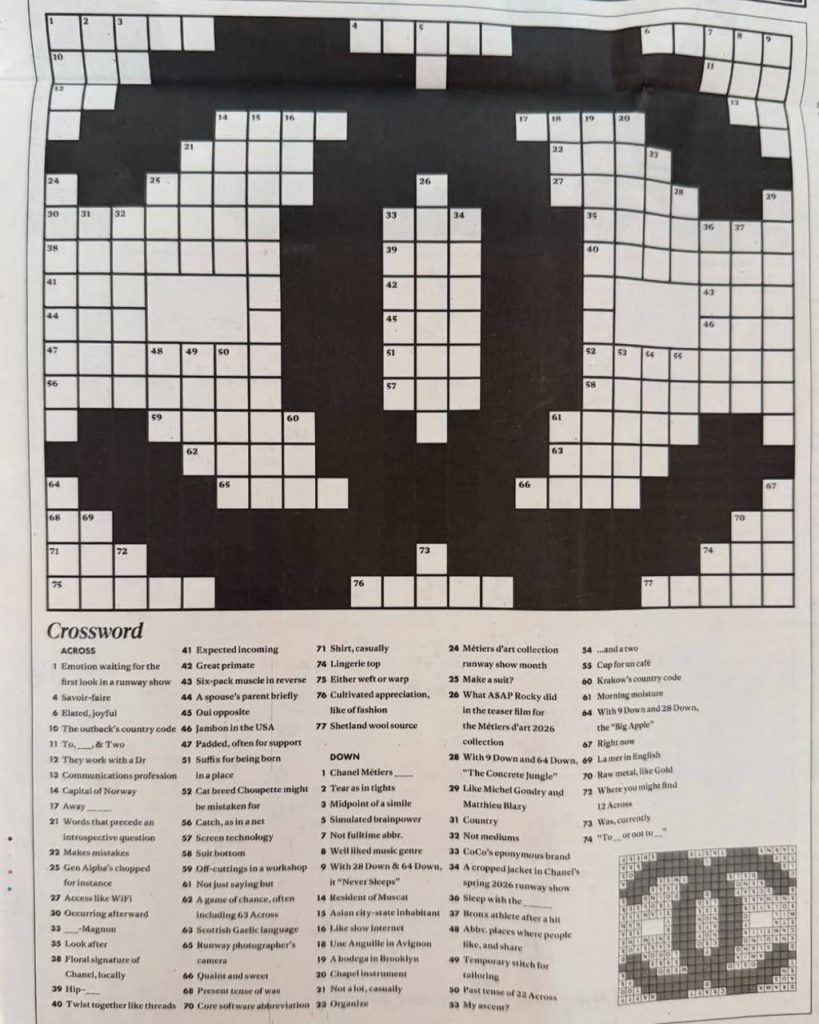 Для первого шоу Métiers d’Art под руководством Матье Блази гости получили по-настоящему нью-йоркские приглашения – в виде газет. Каждое из них содержало кроссворд и игру, в которой при соединении всех точек появлялась камелия – фирменный символ Chanel. На страницах также были намеки на место показа, а подвеска с вагонами поезда лишь подогревала слухи о том, что шоу пройдет прямо в метро.