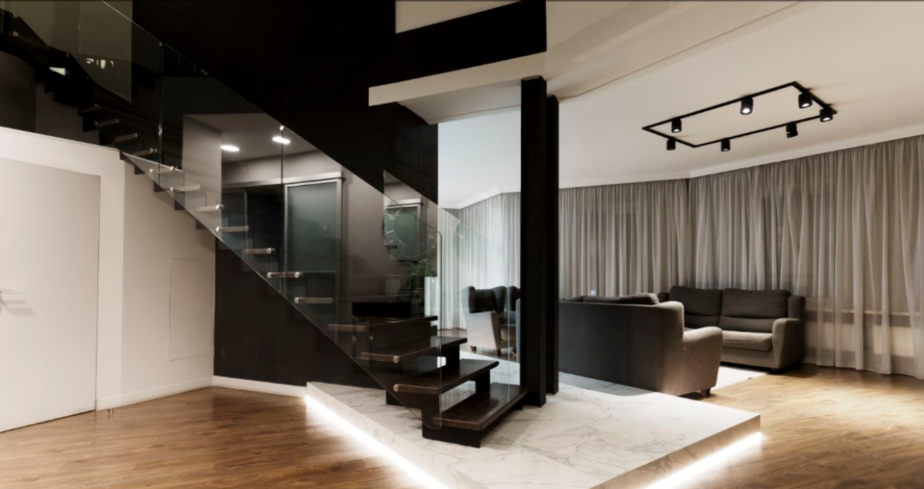 Общая площадь квартиры 288 квадратных метров. На первом этаже есть гардеробная, спальня, ванная, санузел и кухня-гостиная. Тут же несколько зон отдыха: с телевизором, диванами и искусственным камином.