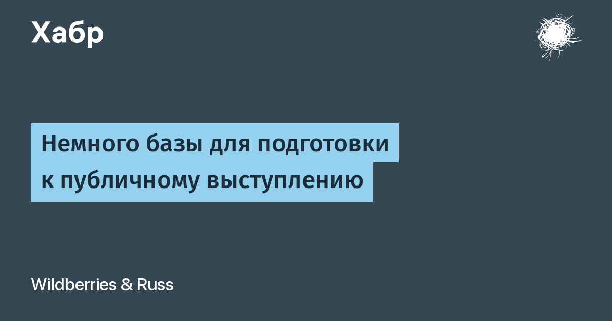 Всем привет! На связи Александр Гирев, Mobile Lead в команде ценообразования в проекте WB Partners. Публичные выступления плотно вошли в мою жизнь ещё в школе. Мне довелось выступать на школьных мероприятиях, научных конференциях, собраниях, занятиях. В числе необычных аудиторий — собрание офицеров и иностранные студенты из Африки. Последние несколько лет моя целевая аудитория — участники ИТ-мероприятий. Год назад я начал делиться опытом публичных выступлений: в команде появился запрос на подготовку спикеров для внутренних Dev Talks и внешних мероприятий. Для этого я решил выделить базовые шаги при подготовке публичной речи, которые изложены в настоящей статье. Это каркас для развития навыка публичных выступлений. Важно отметить, что речь пойдет не только про доклады на конференциях. Описанные принципы можно использовать для презентации результатов работы, выступления перед командой, проведения занятия и др. Текст рассчитан на начинающих спикеров, опытные докладчики также смогут почерпнуть что-то новое или уложить имеющиеся знания в систему. Список рекомендаций не исчерпывающий, делитесь опытом и советами в комментариях! Итак, начнём