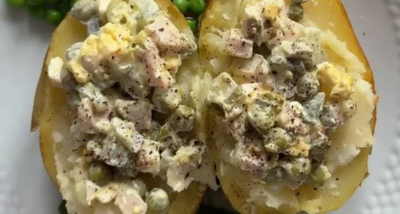 Приготовление: Картофель промыть, 7 минут в микроволновке, затем запечь в духовке. Разделить пополам, смазать сливочным маслом, размять вилкой. Выложить оливье, украсить горошком и зеленью.