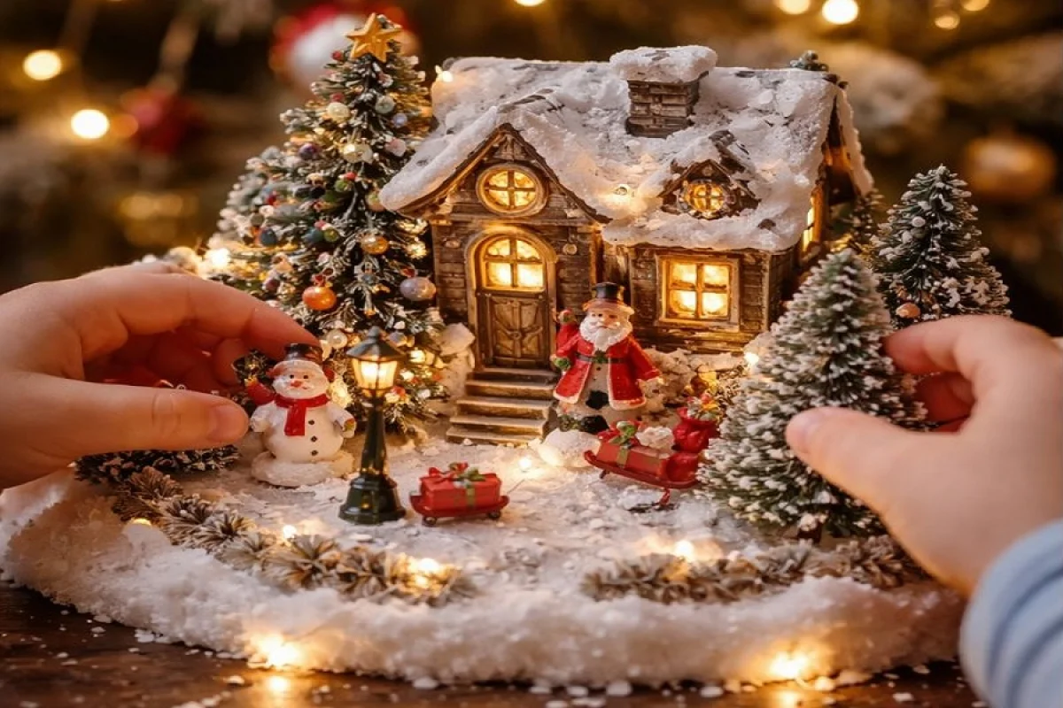 В его мини-городе оживают зимние пейзажи, фабрика ёлочных игрушек и замёрзшее озеро, где дети играют в хоккей. Главный герой праздника – Дед Мороз на санях, завершает волшебную картину.