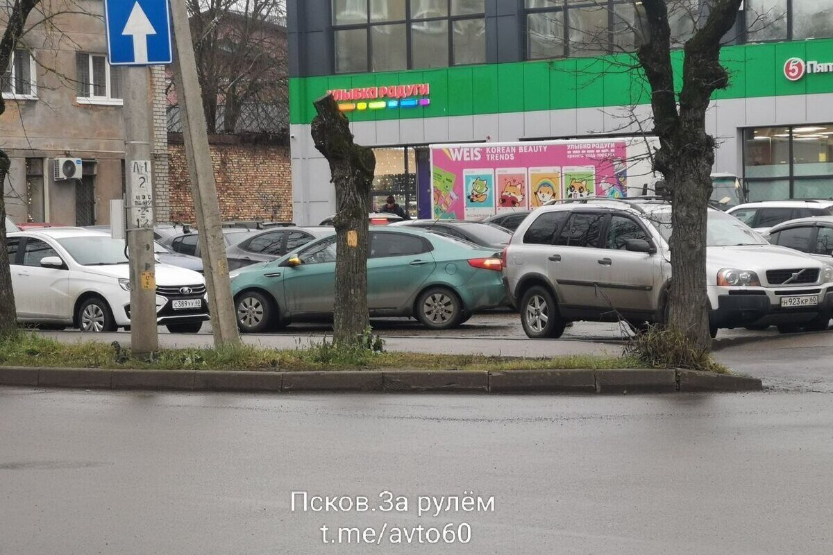 В Пскове произошло ДТП на парковке у амагазина "Пятерочка", расположенного на улице Некрасова, 42. Очевидцы опубликовали фото в телеграм-канале "Псков за рулем".
