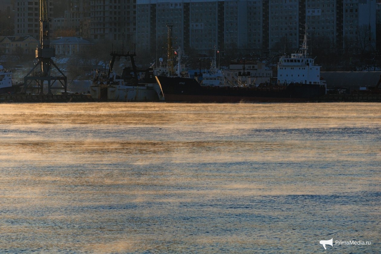 PrimaMedia, 4 декабря. Жители Владивостока стали свидетелями необычного зрелища утром 4 декабря — акватория бухты Золотой Рог была окутана густым паром, создавая впечатление, будто вода "кипит".
