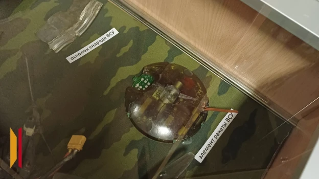 Бойцы, которые выпустились из школы, передали оборудование и обмундирование: беспилотный летательный аппарат, каску, шевроны, элемент ракеты и осколок снаряда.