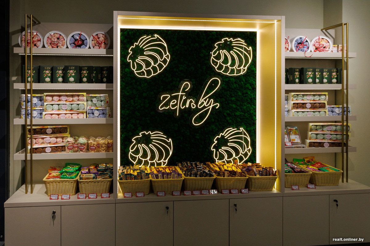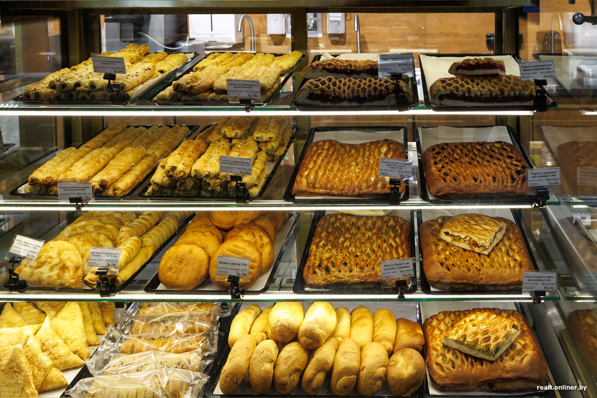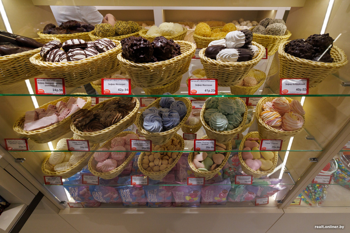 Заходим в помещение, уютно пахнущее сдобой, — в фирменный магазин «Слодыч». Всего в Минске семь магазинов предприятия, которое, кстати, в последнее время выпускает залетающие ролики в соцсетях. Новый «Слодыч» открылся здесь в начале сентября.