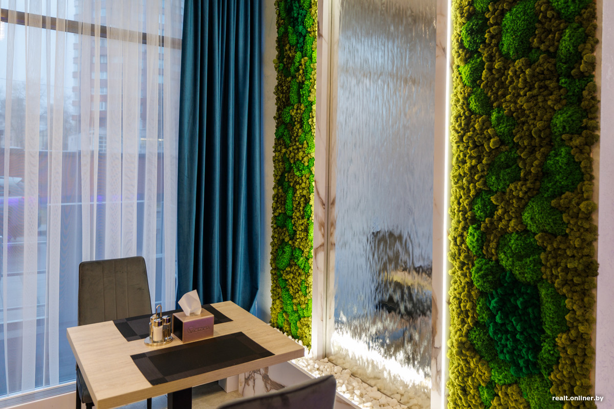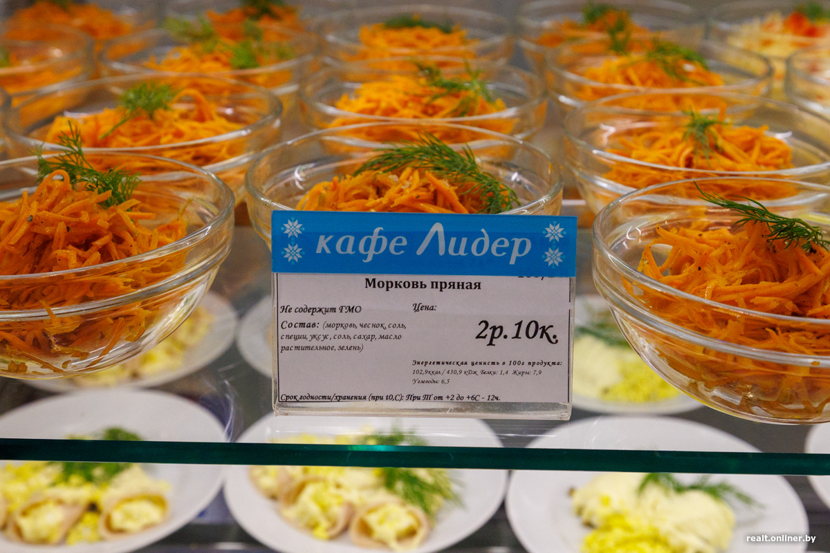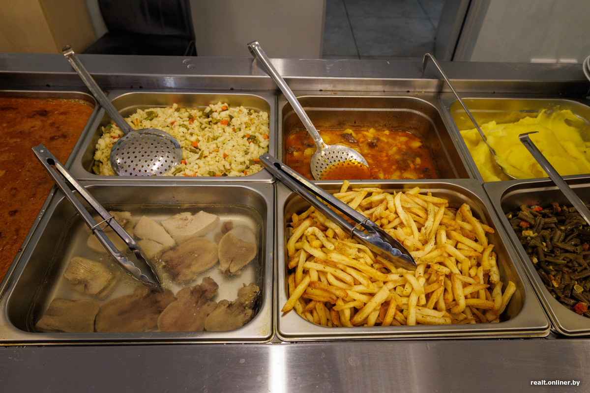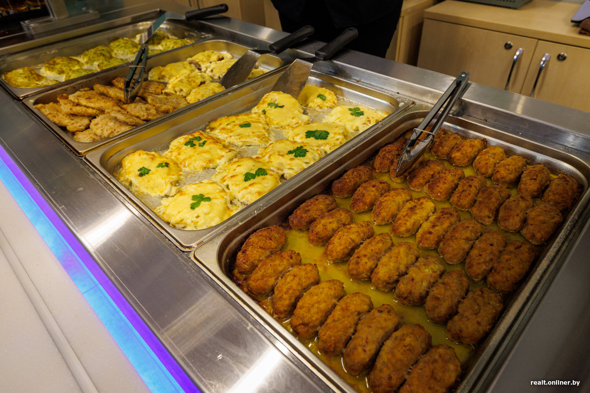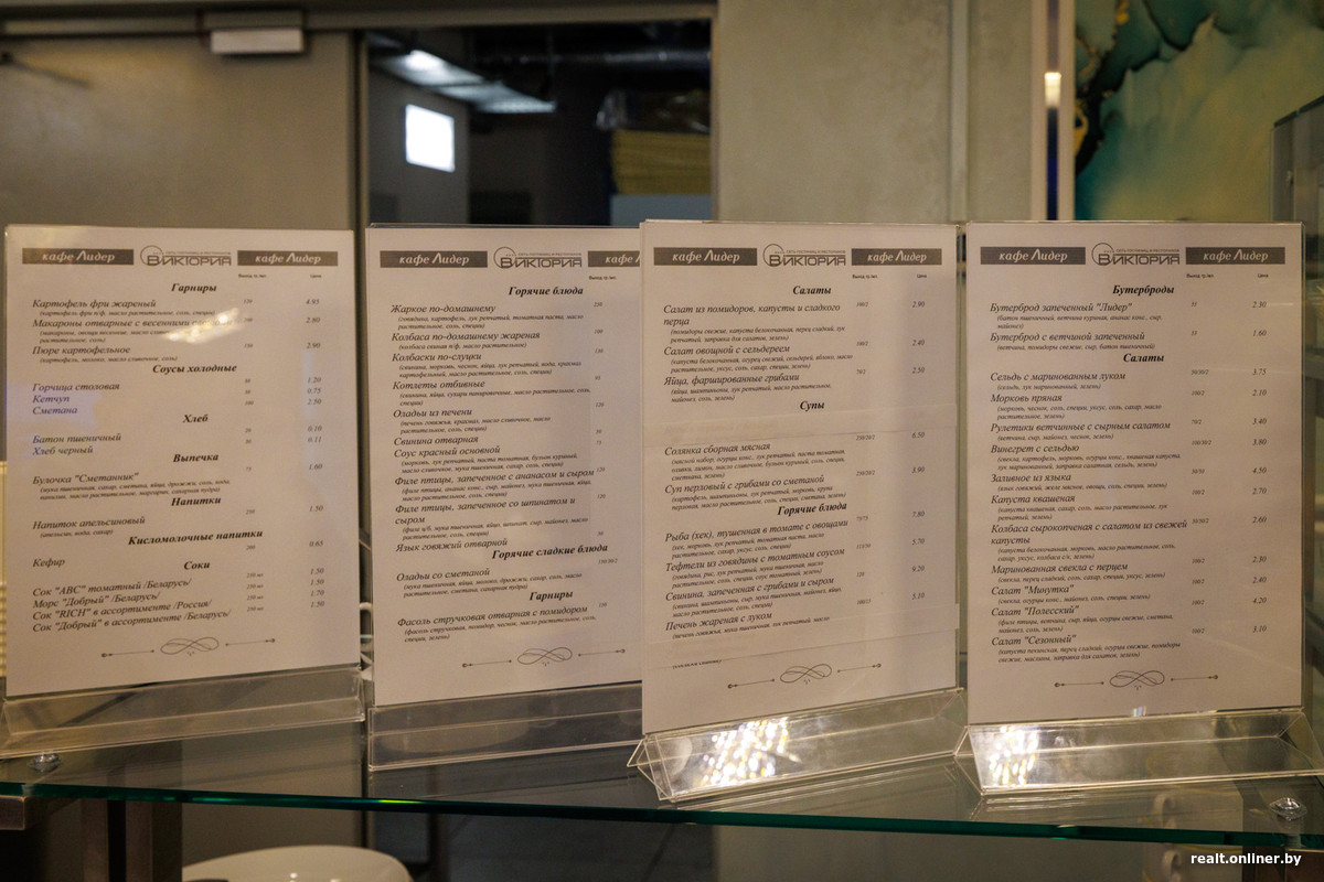Поесть можно и в кафе «Лидер» от сети отелей и ресторанов «Виктория». По формату это столовая с зоной раздачи, но оформили место точно не по-столовски: мягкие диванчики, торжественные люстры, декор с водопадом и камнями. Основа меню — белорусская кухня.