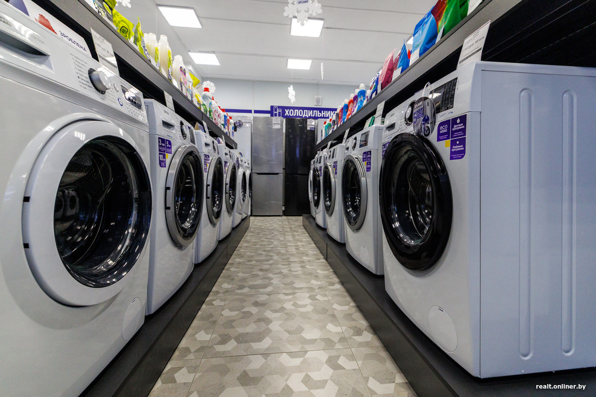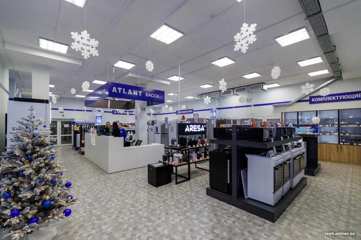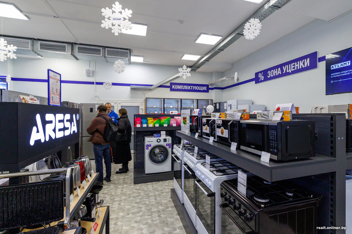 Бренд «Атлант» занял одно из самых эффектных помещений: стильные графитовые фасады с панорамным остеклением и вывеска, сразу видная с проспекта. Заведующая Татьяна рассказывает, что всего в Минске три фирменных «Атланта», но этот магазин отличается от других интересным оформлением. Например, на столбах здесь можно увидеть дисплеи с историческими фактами о бренде.