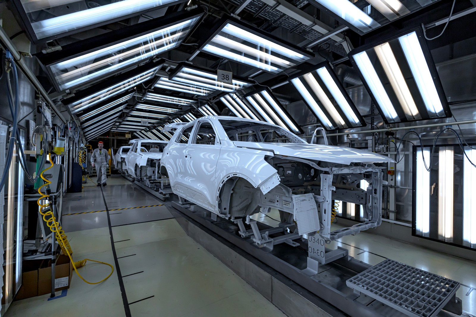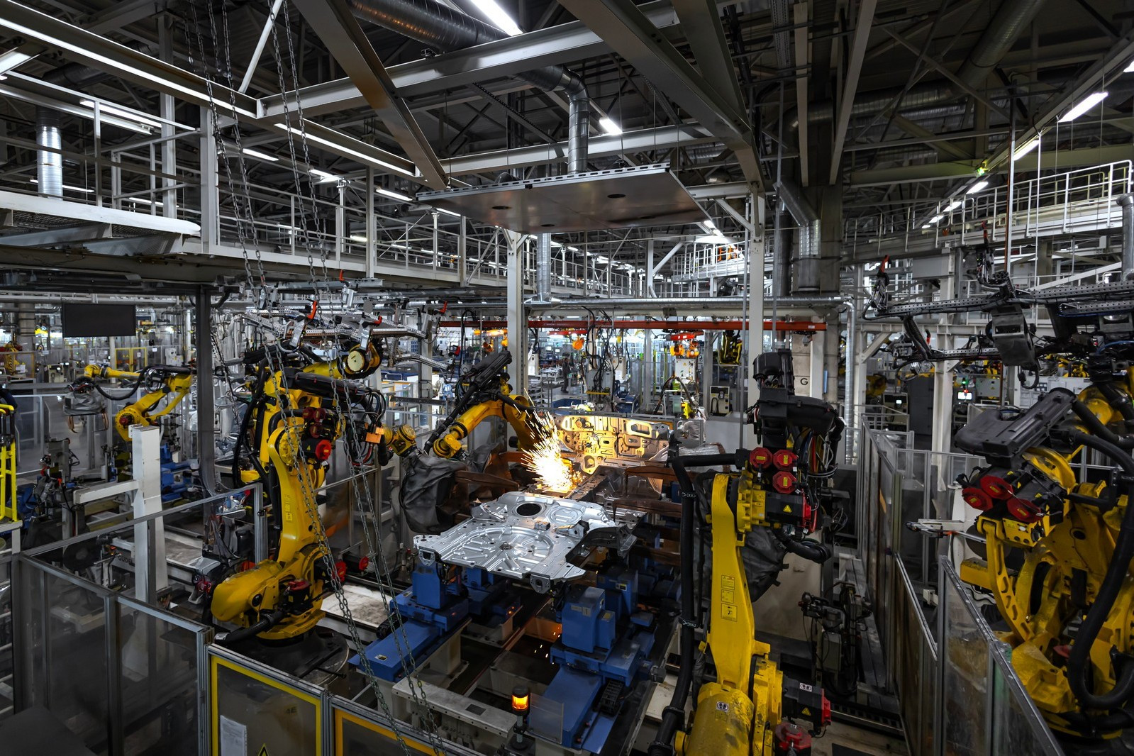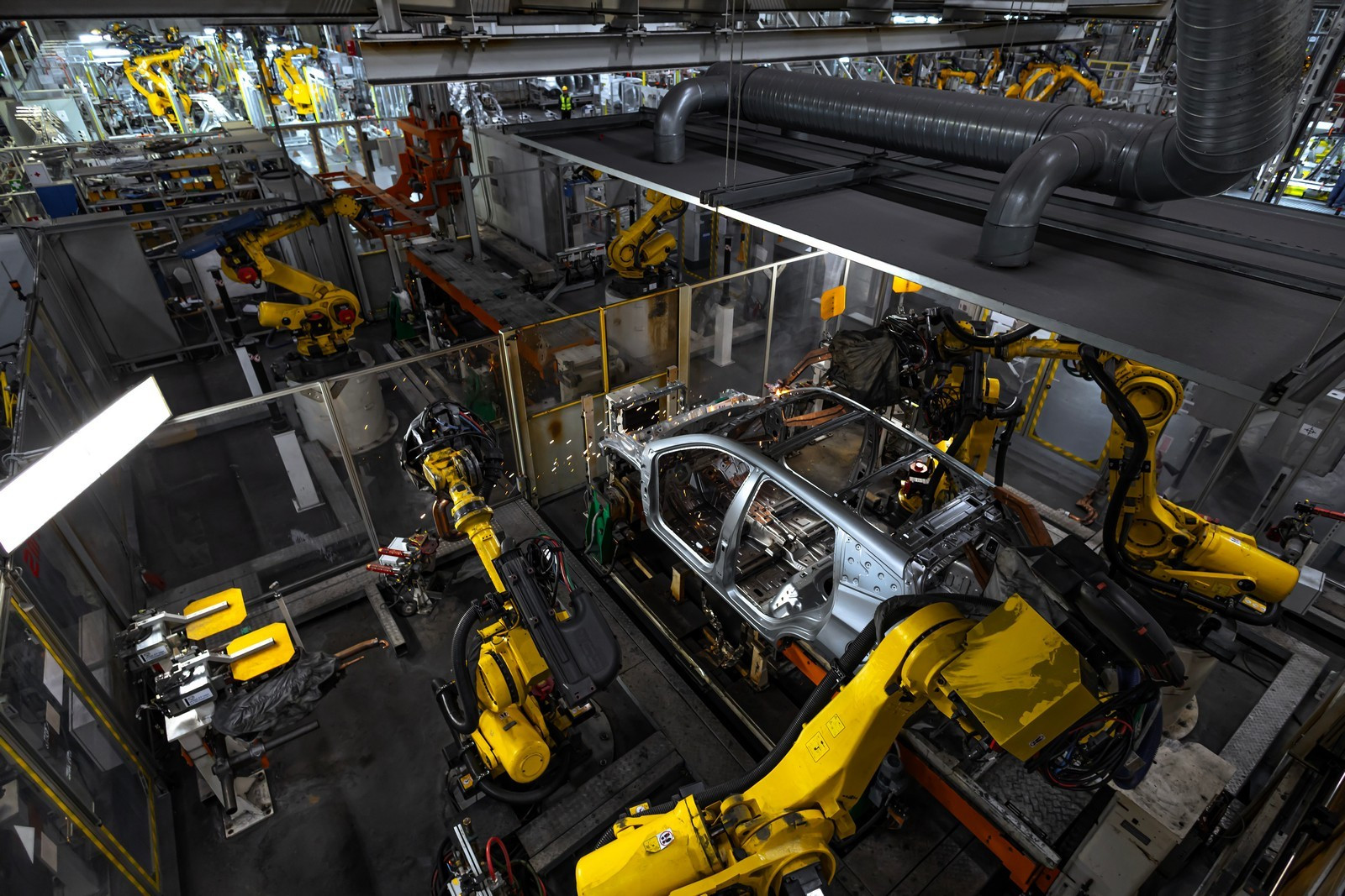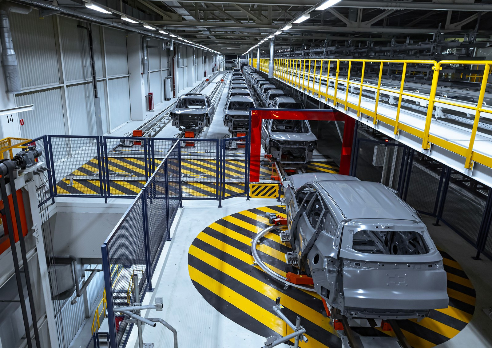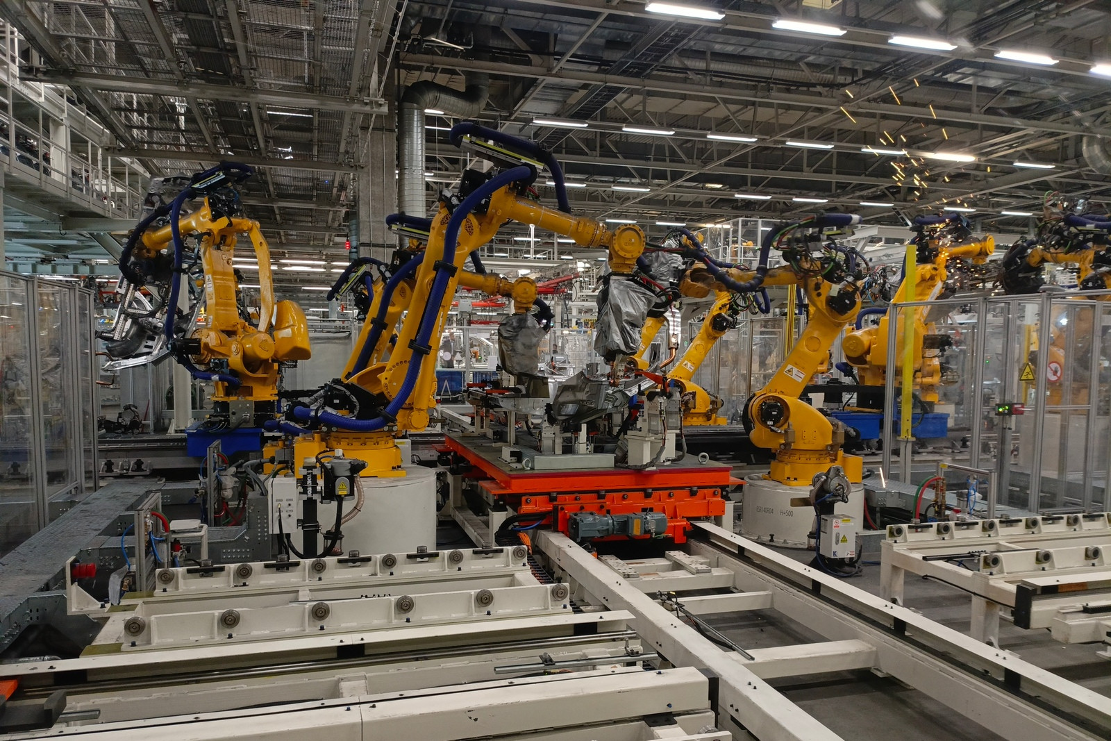 Сегодня в цехах сварки общей площадью почти 72 тысячи квадратных метров трудятся 332 робота, которые наносят порядка трех метров сварных швов на каждый кузов. Помимо этого, в арсенале производства 30 клеевых станций, которые обеспечивают нанесение 51 метра клеевых соединений. Чтобы связать все эти посты в единую линию, сформирован конвейер длиной 3300 метров.