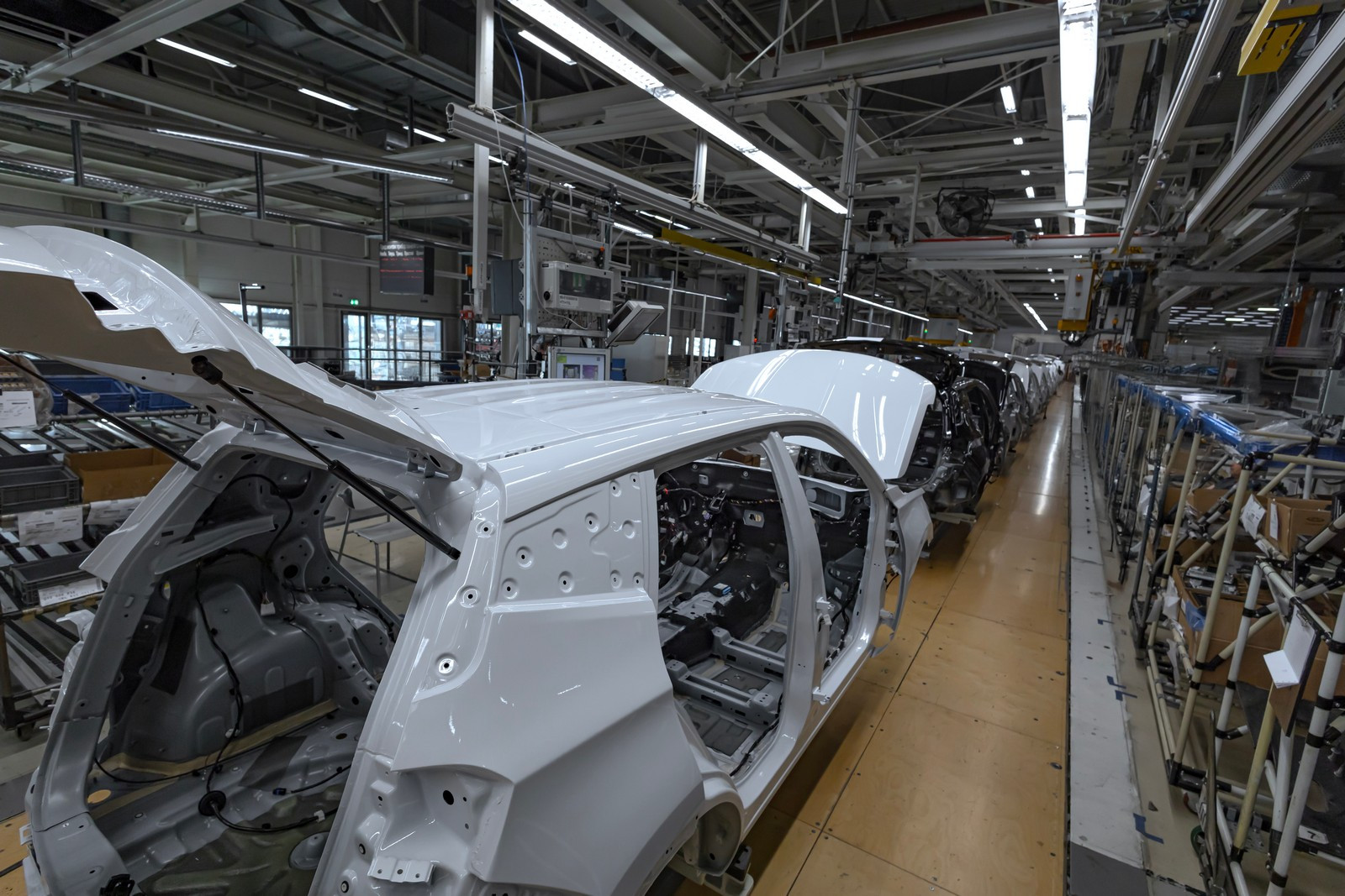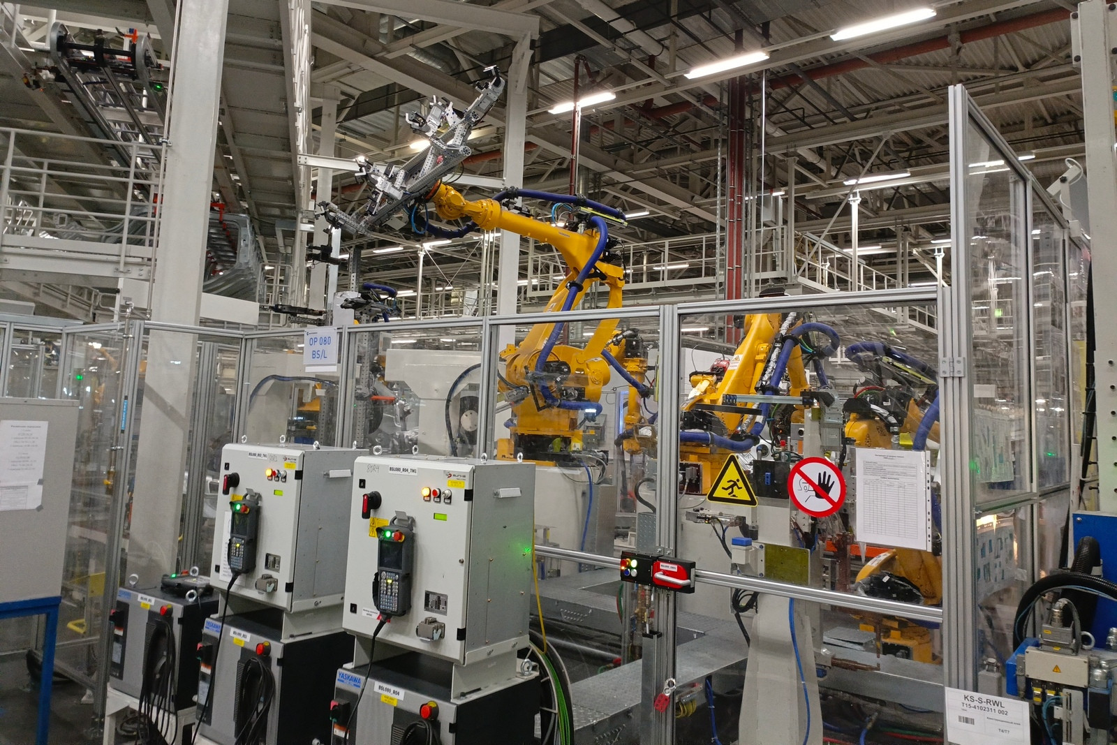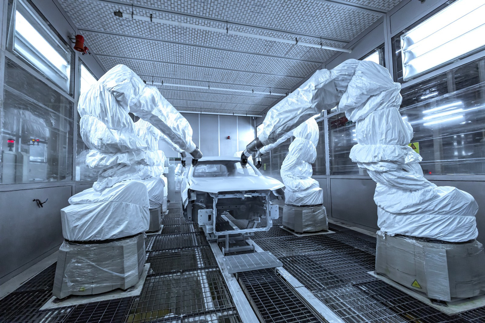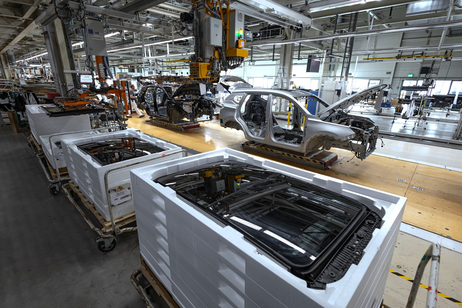 Сегодня в цехах сварки общей площадью почти 72 тысячи квадратных метров трудятся 332 робота, которые наносят порядка трех метров сварных швов на каждый кузов. Помимо этого, в арсенале производства 30 клеевых станций, которые обеспечивают нанесение 51 метра клеевых соединений. Чтобы связать все эти посты в единую линию, сформирован конвейер длиной 3300 метров.