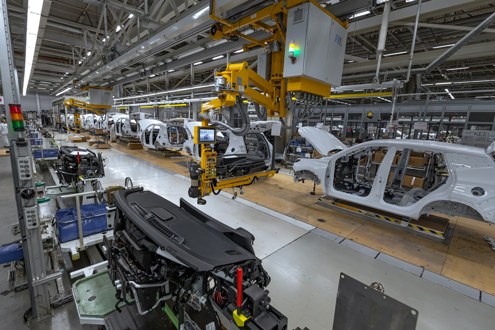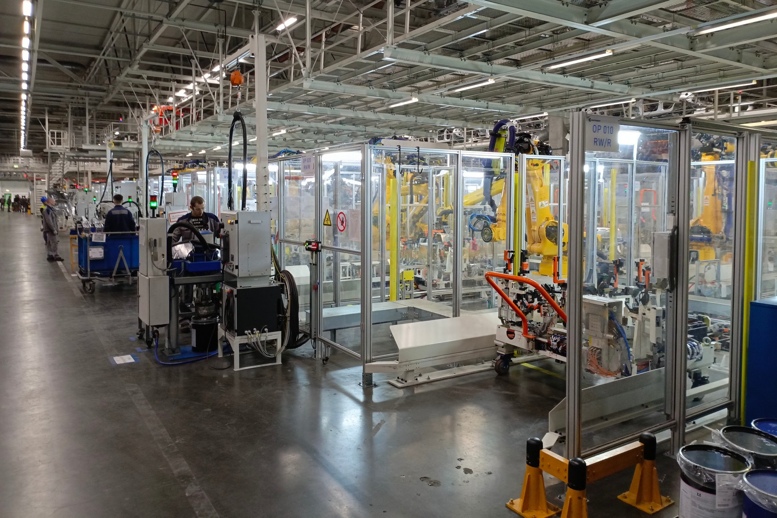 В силу специфики — это наименее автоматизированное производство (не только на этом заводе, но и вообще в автомобилестроении). На нем используется лишь четыре робота и 13 манипуляторов. Поэтому уровень автоматизации составляет всего 5%, но как и все остальные участки, как и весь завод в целом, в данный момент оно выдает на финише 41 автомобиль в час.