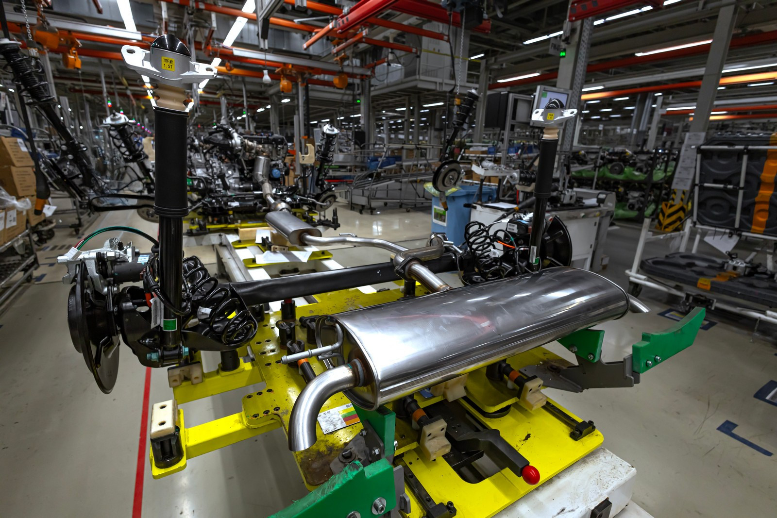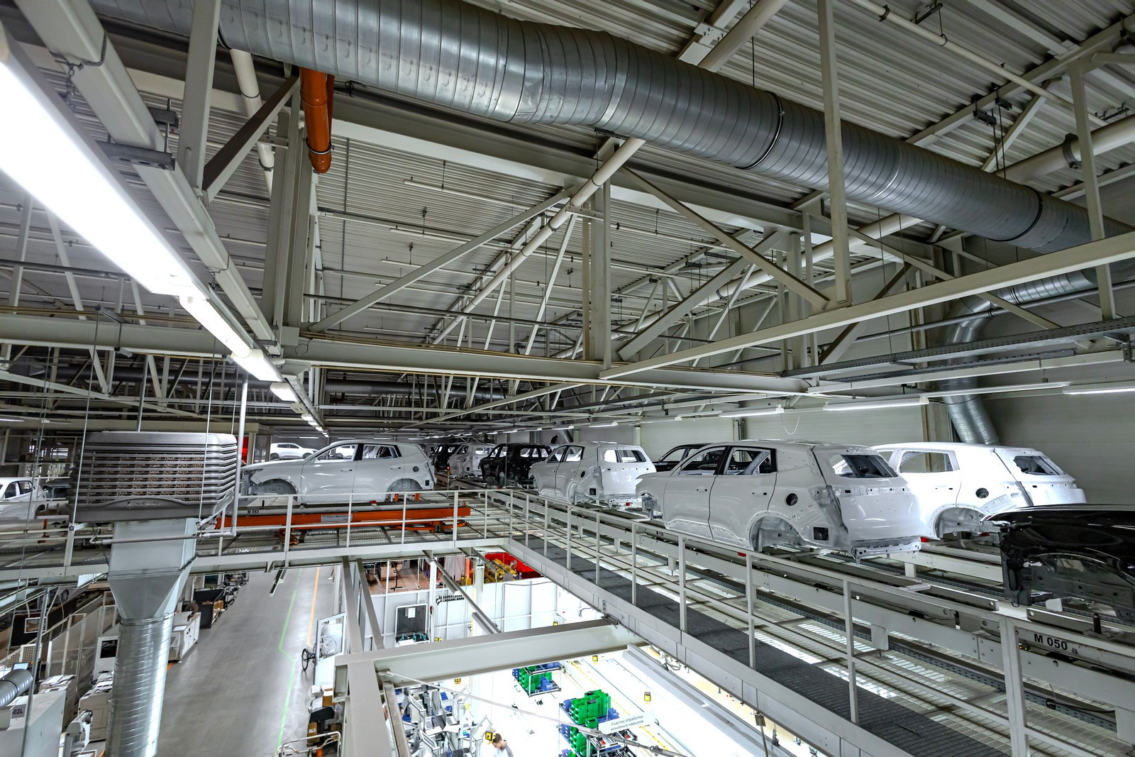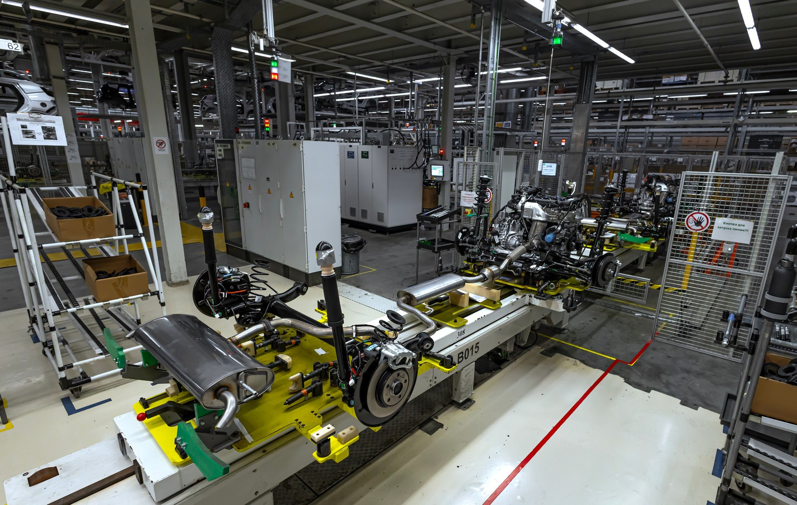 Перемещение кузовов из окраски в сборку происходит по верхнему ярусу. Прежде чем попасть на главный конвейер, составные части будущего автомобиля проходят через четыре участка предмонтажа: передней панели, задней оси, шасси, дверей. Только после этого они оказываются на главной ленте, где шаг за шагом, а точнее такт за тактом, к финальному 125 такту автомобиль приобретает свою окончательную форму.