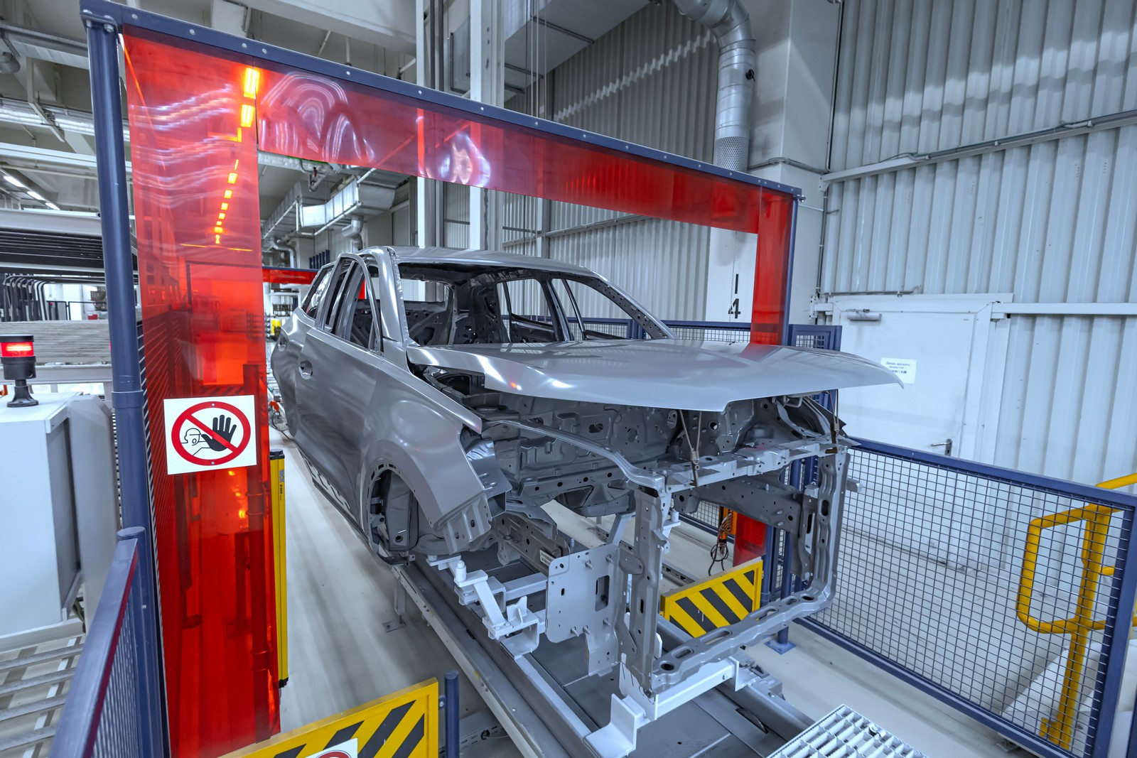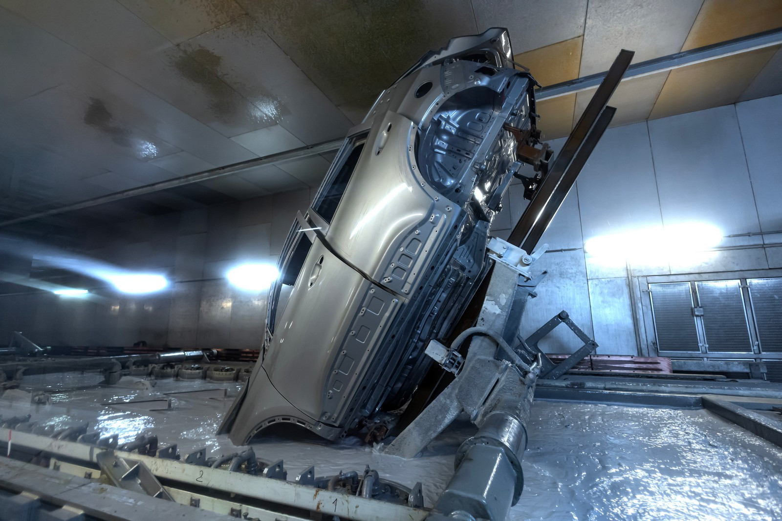 В технологических целях были организованы новые участки: станция фиксации кузова перед катафорезом, накопитель для катафорезных скидов и станция разблокировки кузова после катафореза. Кстати, о катафорезе. На заводе применяется довольно интересная система нанесения катафорезного грунта под названием RoDip (Rotational Dip Coating), при которой кузов проходит полную ротацию в ванной объемом 238 кубических метров. Это позволяет раствору попадать во все скрытые полости и обеспечивает максимальную коррозионную устойчивость автомобилей. Такой вид оборудования есть только на еще одном предприятии.