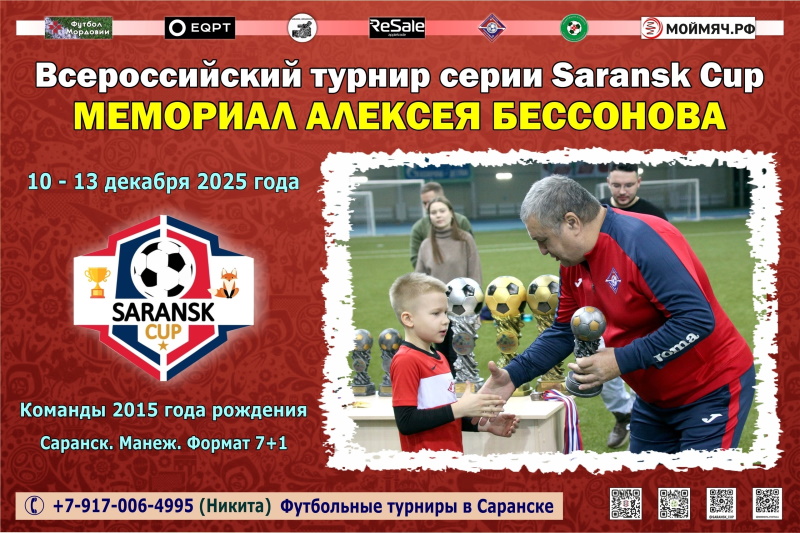 Всероссийский турнир по футболу «Мемориал Алексея Бессонова» пройдет в Саранске с 10 по 13 декабря. Как сообщает телеграм-канал «Футбол Мордовии», участниками соревнований станут сорок команд из разных городов, в том числе Москвы, Санкт-Петербурга и Казани.