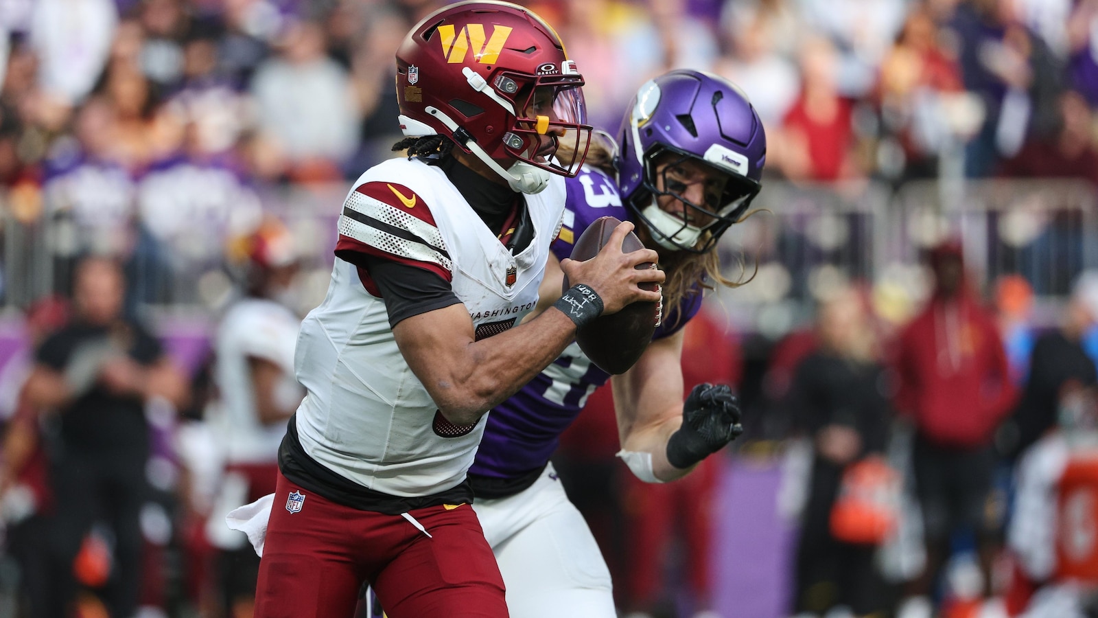 He tried to hit wideout Terry McLaurin with a quick pass toward the left sideline. But Vikings edge rusher Andrew Van Ginkel jumped in front of the ball and secured the deflection for an interception and 40-yard return.