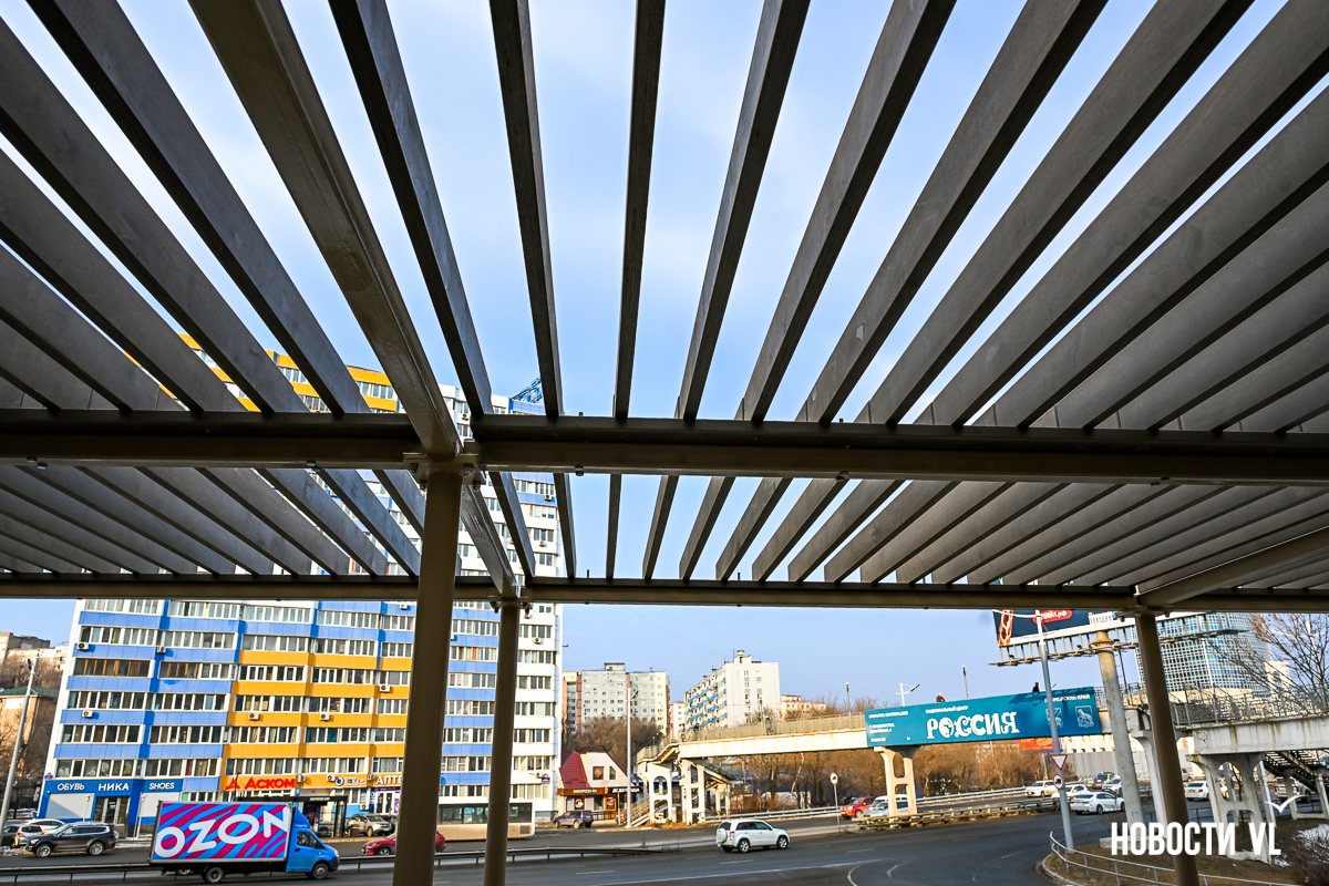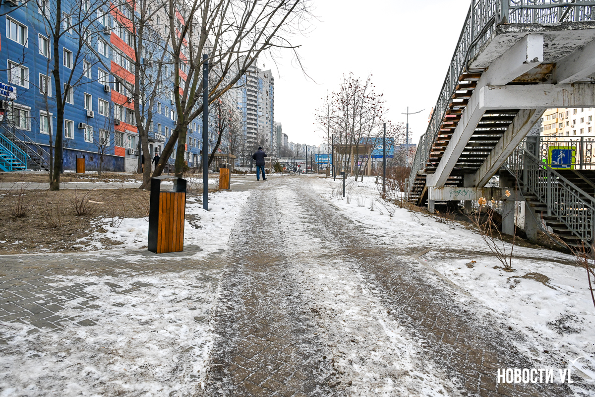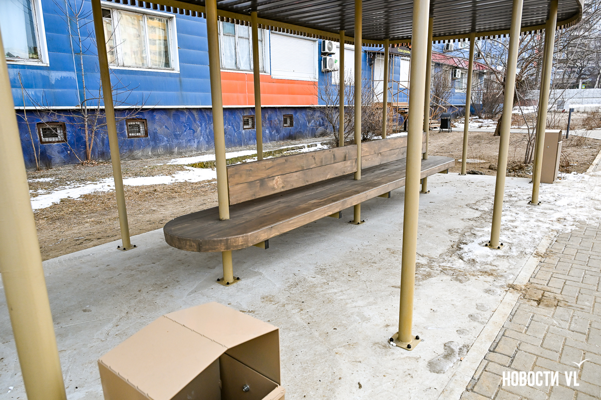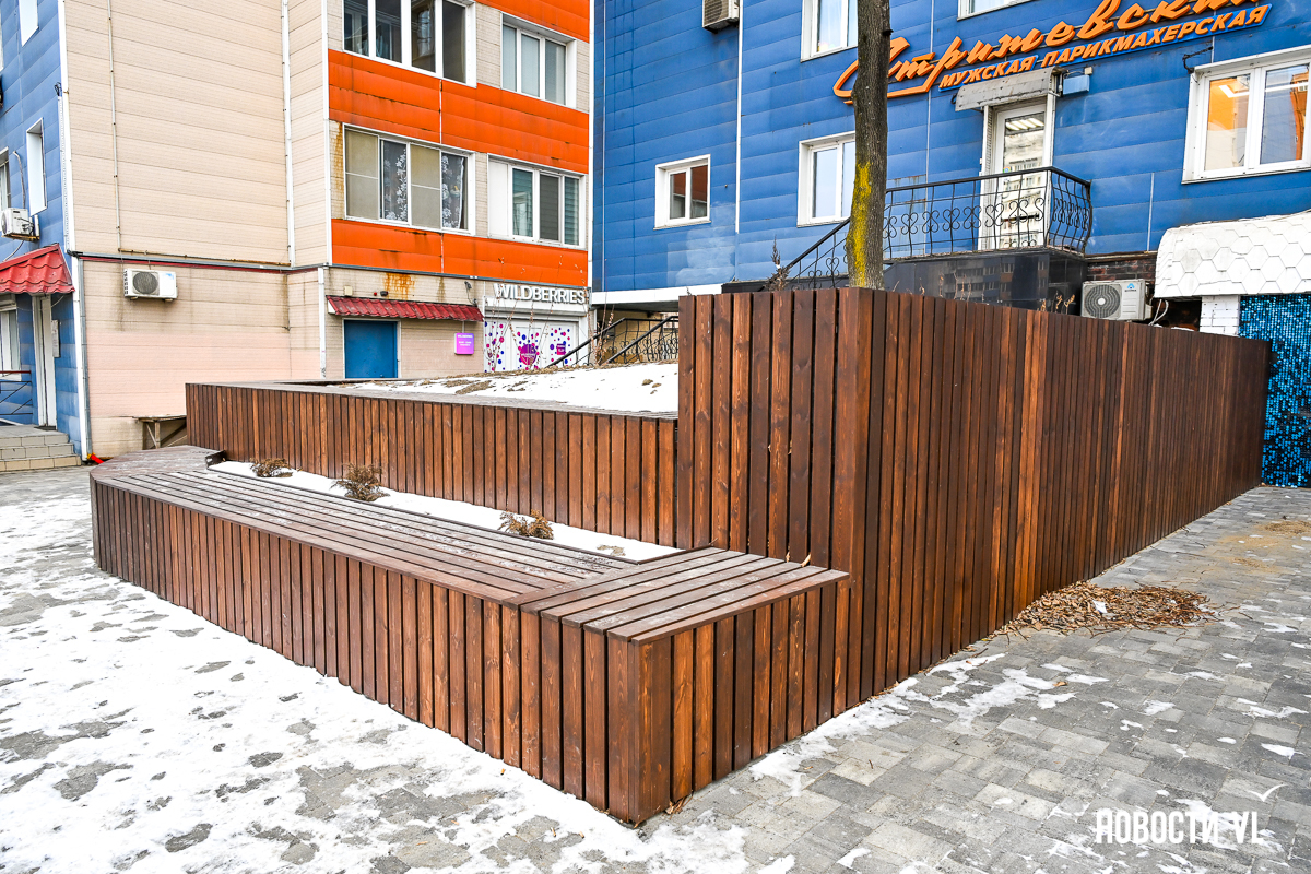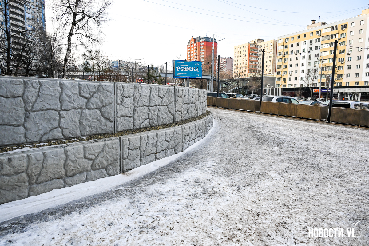 Возле дома № 96 по программе «1000 дворов Дальнего Востока» (она же – «Благоустройство дальневосточных дворов») построили две подпорные стены возле арки (проход между домами № 96 и 98). Одна – деревянная, с переходом в скамьи, вторая облицована камнем. Правда, из-за такой планировки территории, если идти сверху в сторону путепровода не по основной дорожке и не глядя под ноги, вполне возможно упасть – не помешало бы дополнительное ограждение.