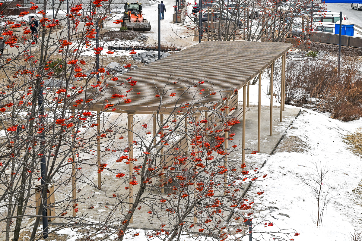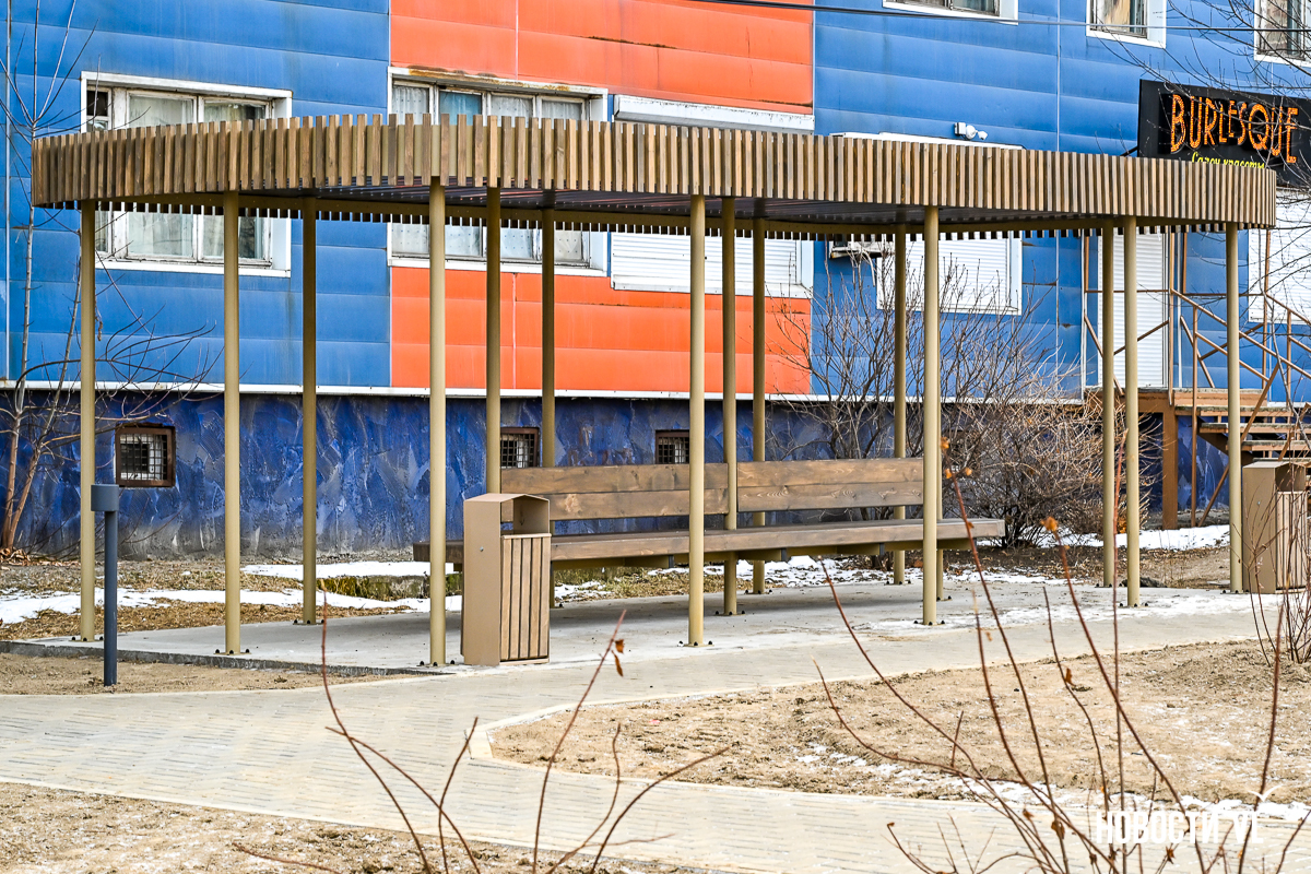 Скамейки в сквере пока есть только у пергол – теневых навесов. Один, ближе к дому, уже со сплошной крышей. Вторая конструкция, ближе к дороге, имеет только поперечные деревянные балки кровли. Возможно, сверху это ещё будет накрыто затемнённым оргстеклом от осадков и солнца. Примерно в 10 метрах стоят три большие качели на 2-3 места.