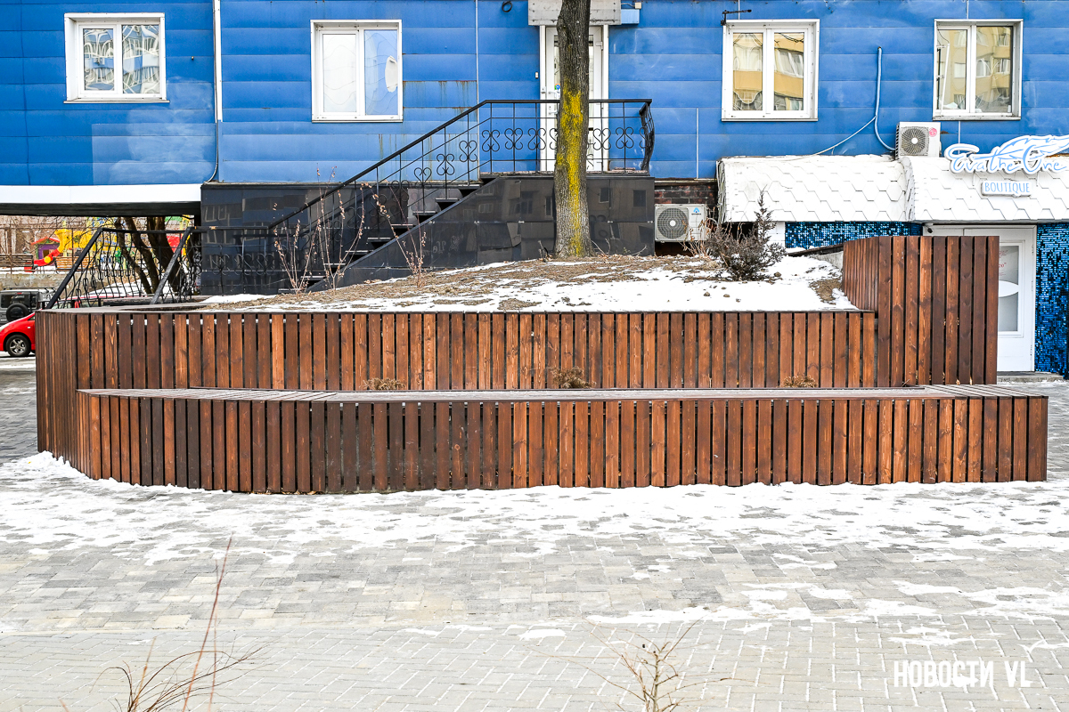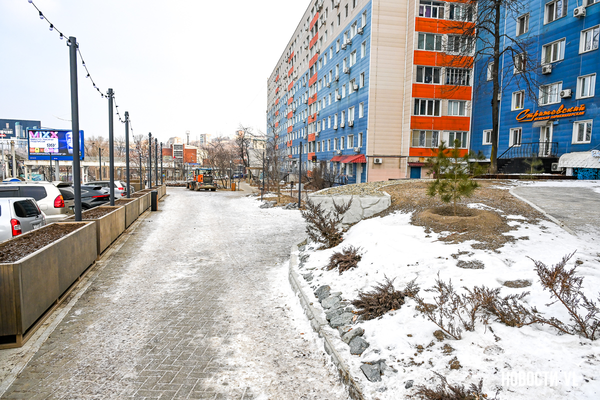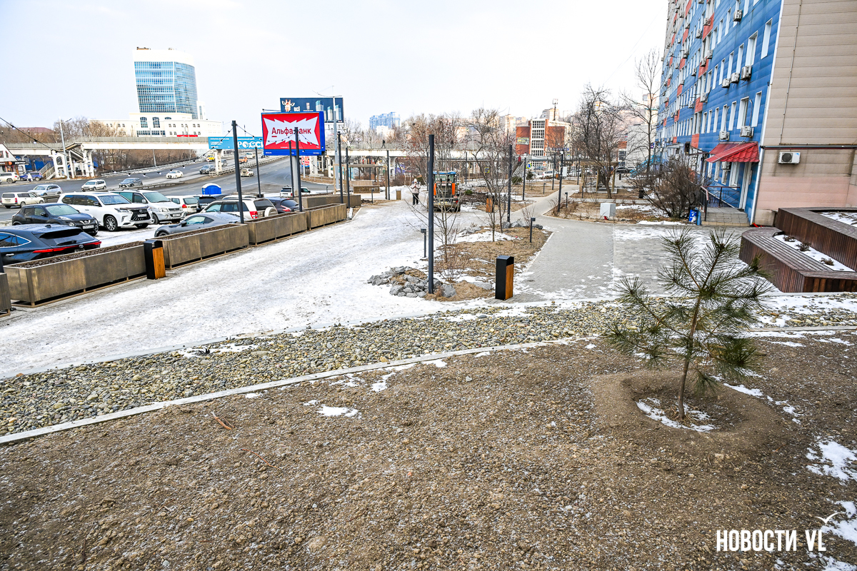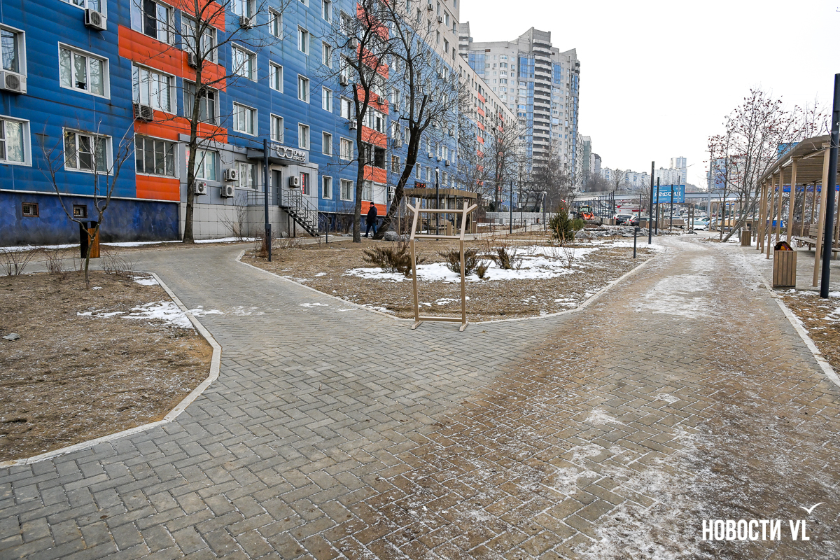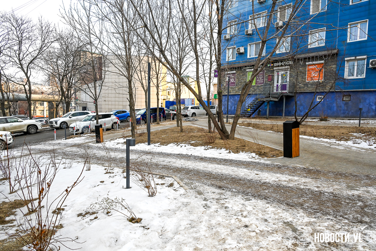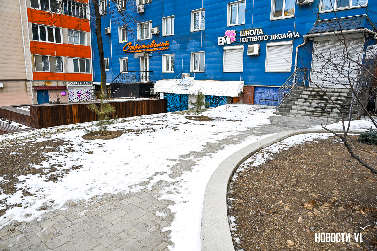Ещё возле Некрасовской, 96 сделали новые тротуары из брусчатки, клумбы с бордюрным ограждением из бетона, высадили хвойные деревья, установили скамейки и урны из переработанного пластика, демонтировали две рекламные конструкции (остались только основания столбов). В целом эта часть единого общественного пространства выглядит более завершённой, чем сквер около 98-го дома. В пресс-службе администрации Владивостока также уточнили, что со стороны дворового фасада в арке между 96-м и 98-м домами были реконструированы лестницы – эти работы были проведены благодаря победе в конкурсе ТОСов.