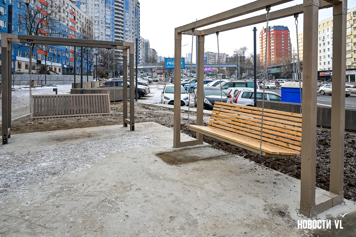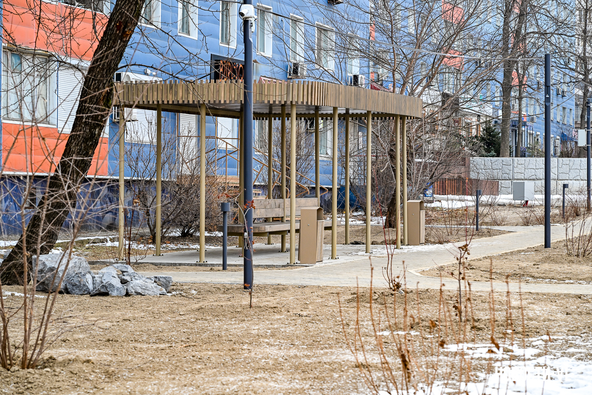 Завершается благоустройство сквера на Некрасовской, 96-98. Здесь сделали широкие тротуары, установили скамейки с навесами, качели, перенесли старые и разбили новые клумбы. Осталось подключить освещение, поставить дополнительные скамейки. Территории в этом году повезло втройне – часть сквера, которая не попадала в границы благоустройства по федеральному проекту, сделали по программе «1000 дворов Дальнего Востока», а по конкурсу ТОС местные жители добились установки новых лестниц между сквером и двором.