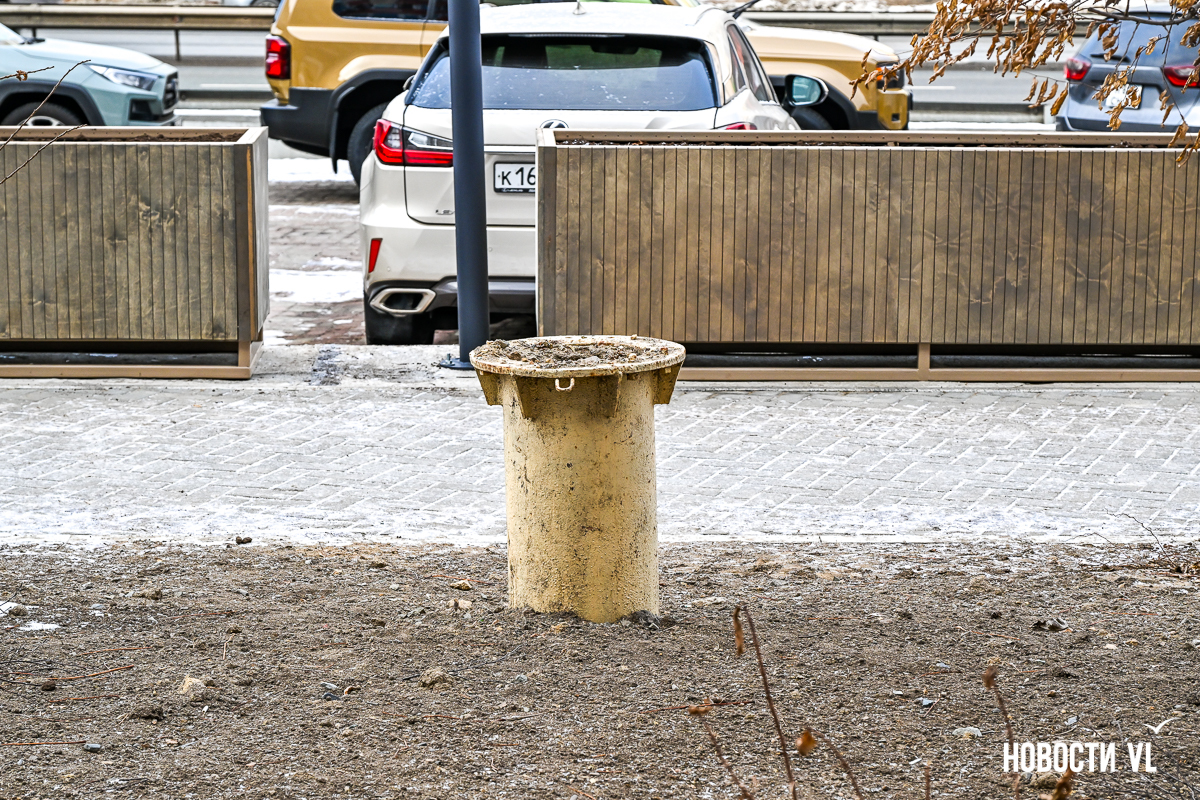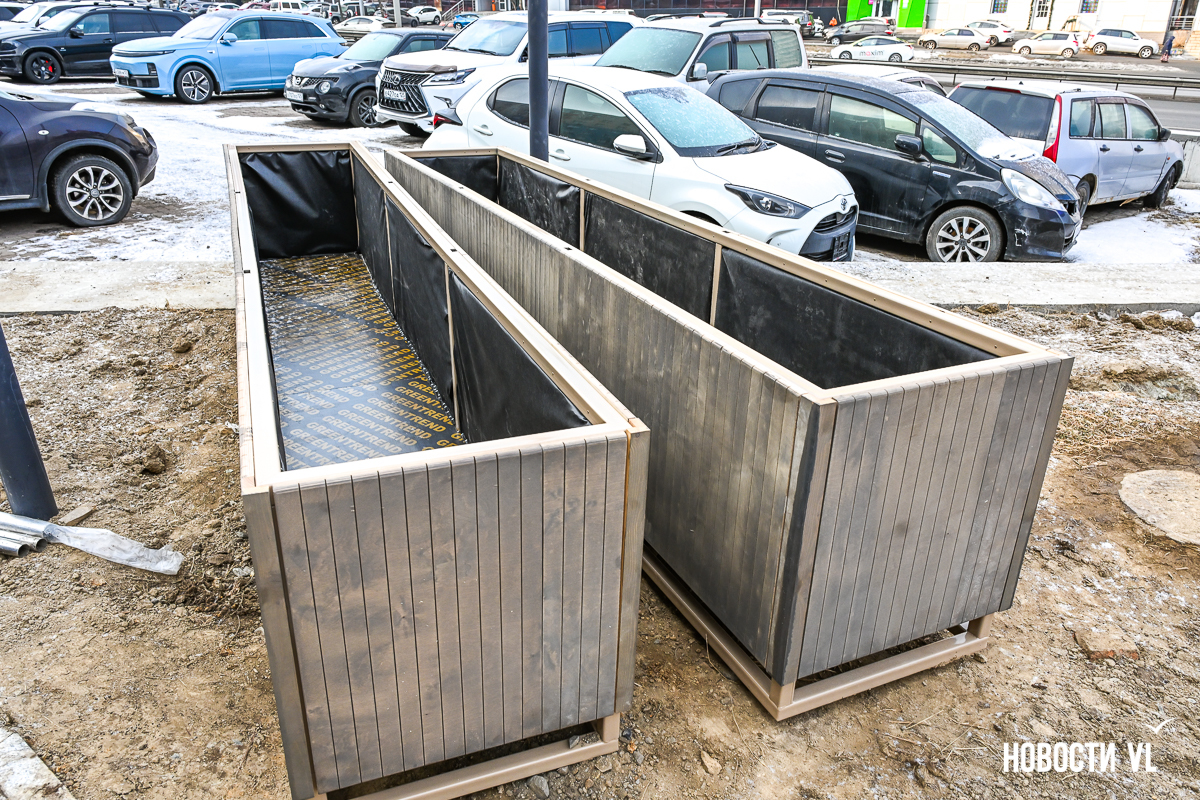 Уже установлены урны, камеры видеонаблюдения и столбы освещения (правда, пока без фонарей). Новые клумбы засажены низкими растениями – больших саженцев деревьев не брали. Стенку, ограждающую парковку от променада (в районе дома № 98) сделали в длинных кашпо, наподобие тех, что ставили на Адмирала Фокина, только там они металлические, а здесь – деревянные. Землю в висячие клумбы уже засыпали, но пока без растений.
