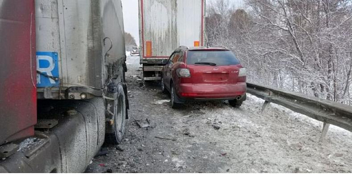 На 267 километре федеральной дороги «Байкал» столкнулись четыре транспортных средства. Предварительно установлено, что водитель грузовика Volvo двигался в сторону Улан-Удэ и нарушал дистанцию, превышая скорость.