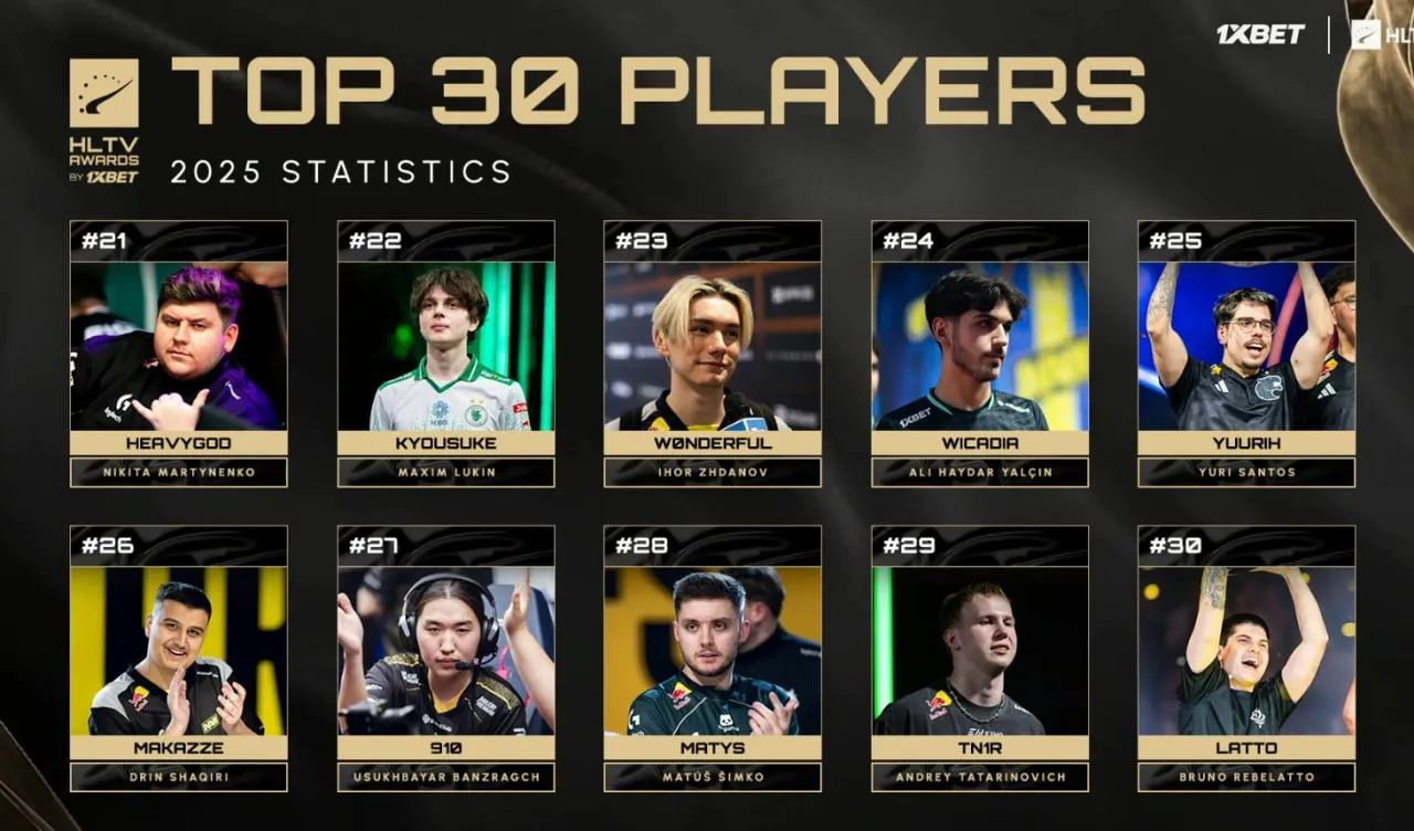 Журналисты HLTV.org назвали киберспортсменов, которые заняли 21-30 места в рейтинге лучших игроков 2025 года. В шаге от попадания в список оказался Никита HeavyGod Мартыненко.