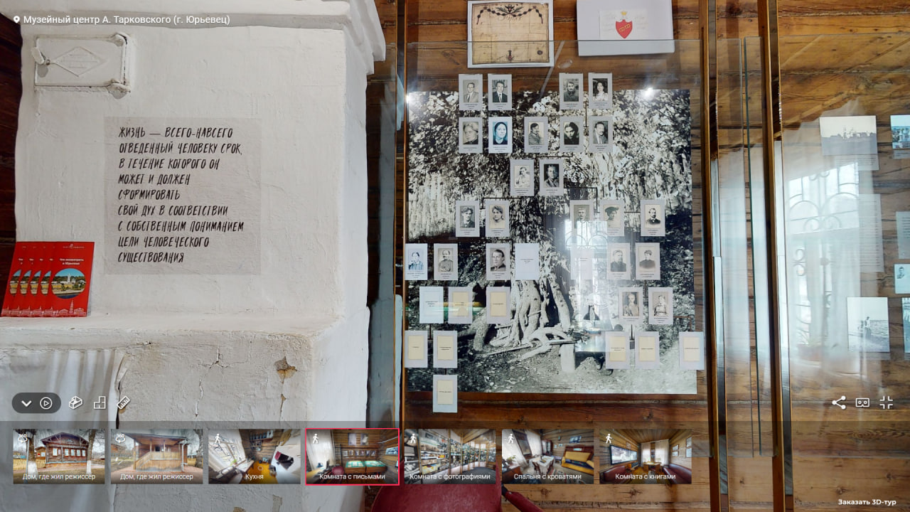 3D-тур будет интересен и тем, кто уже был в музее: можно более внимательно рассмотреть представленные рукописи, письма, документы, личные вещи режиссера и его родителей - поэта Арсения Тарковского и Марии Ивановны Вишняковой.