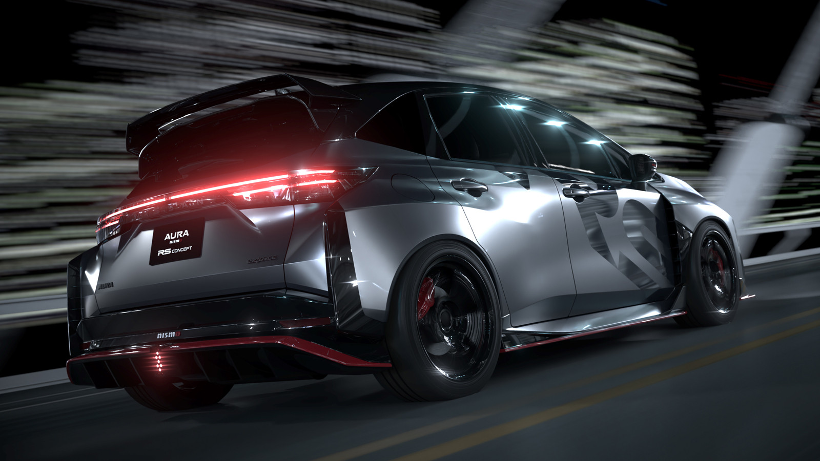 Шоу-кар разработан при участии подразделения NMC (Nissan Motorsport and Customizing). Nissan Aura Nismo RS получил заниженную подвеску, расширенные крылья, а также иной аэродинамический обвес, включающий в себя другие передний и задний бамперы. Это частично повлияло на габариты автомобиля: длина концепта равна 4262 мм (на 142 мм больше, чем у «просто» Aura Nismo), ширина – 1880 мм (на 145 мм больше), высота – 1485 мм (на 20 мм меньше), расстояние между осями, конечно же, осталось прежним – 2580 мм. Вес подрос на 100 кг до 1490 кг.