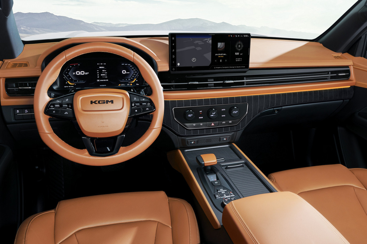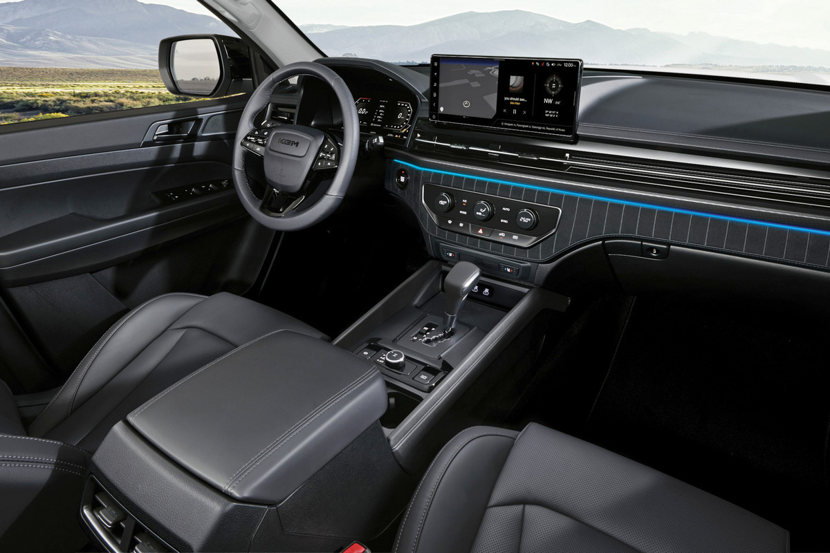 В салоне «простых» версий KGM Musso все так же установлены аналоговые приборы с экранчиком на 3,5 дюйма и кнопочный пульт управления «климатом». Богатым же комплектациям достались новая виртуальная приборка и блок климат-контроля с тремя шайбами, в которые встроены небольшие дисплеи (прежде у дорогих пикапов была сенсорная панель). В списке оборудования Musso еще заявлены мультимедийная система с возвышающимся над передней панелью планшетом (мультимедиа может обновляться «по воздуху»), камеры кругового обзора, адаптивный круиз-контроль, системы автоторможения и удержания в полосе движения.