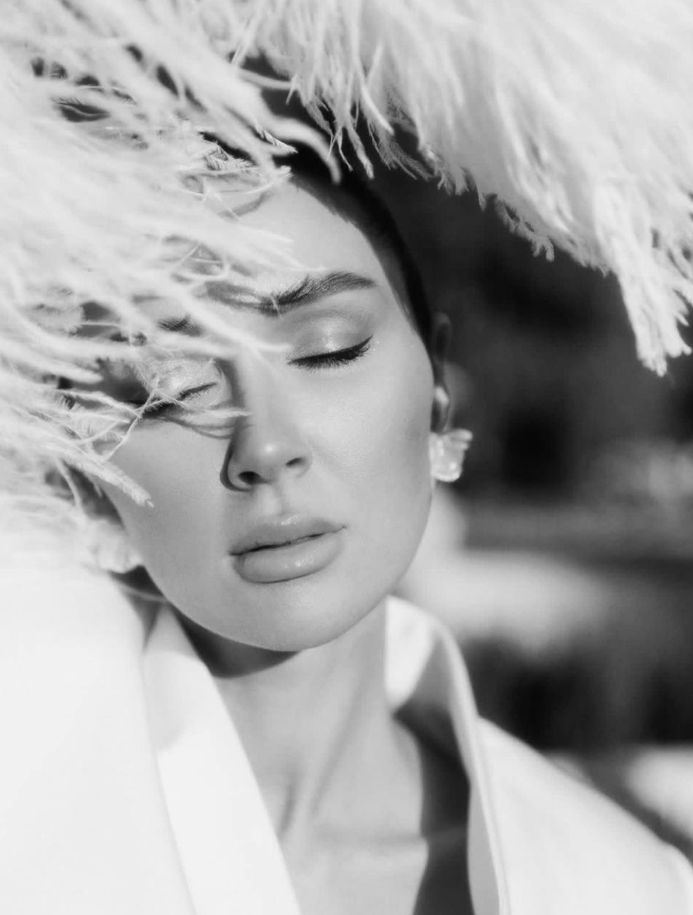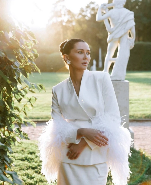 Снимки Анна сделала еще осенью. На них девушка позировала в элегантном белом костюме с приталенным жакетом, украшенным страусиными перьями и длинной узкой юбкой.