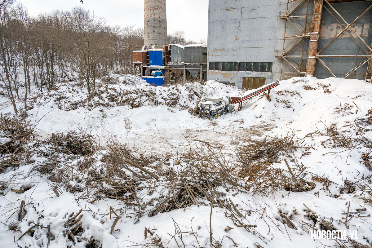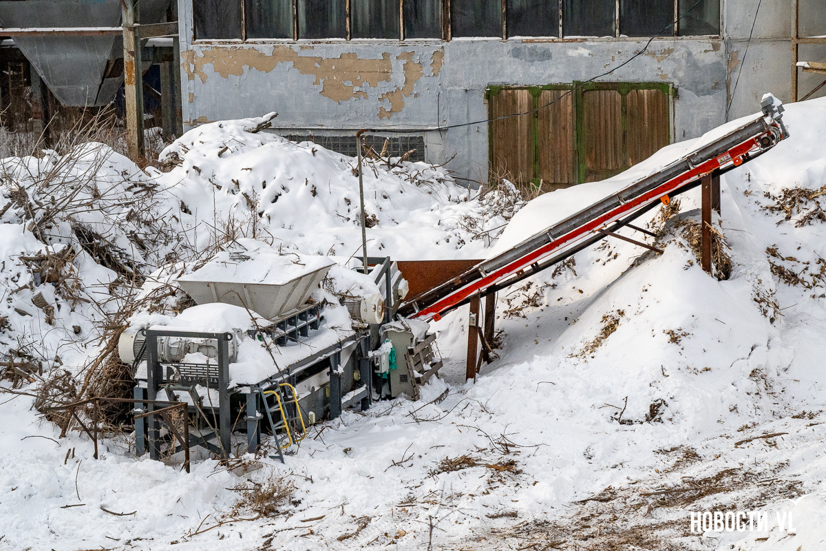 Ёлки перерабатывает в щепу специальная дробилка, которая стоит здесь же.