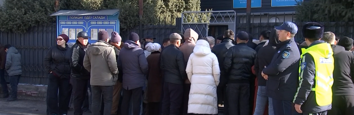 Десятки кандасов с утра собрались возле отдела полиции Талгара, требуя вернуть средства, которые, по их словам, они передали предполагаемой мошеннице.