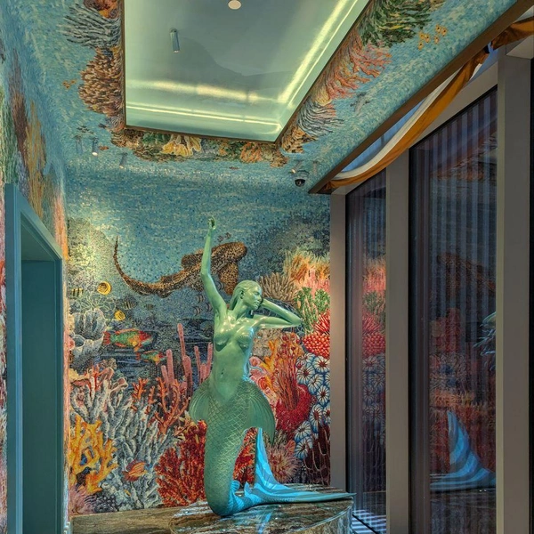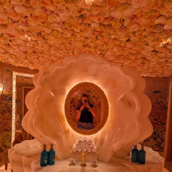 Интерьер — словно выставка в современном музее искусства или декорации в знаменитом театре: стены с разноцветными ракушками, скульптуры Дэмиена Херста, роскошная уборная-будуар с потолком в розах. А еще — вид на Бурдж-Халифу, самое высокое здание в мире.