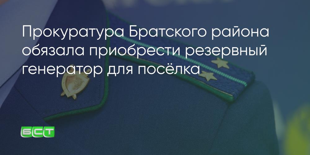 Суд удовлетворил иск прокурора Братского района, обязав районную администрацию приобрести резервный электрогенератор для одной из поселковых котельных. Об этом сообщает Братская студия телевидения со ссылкой на пресс-службу Прокуратуры Иркутской области.