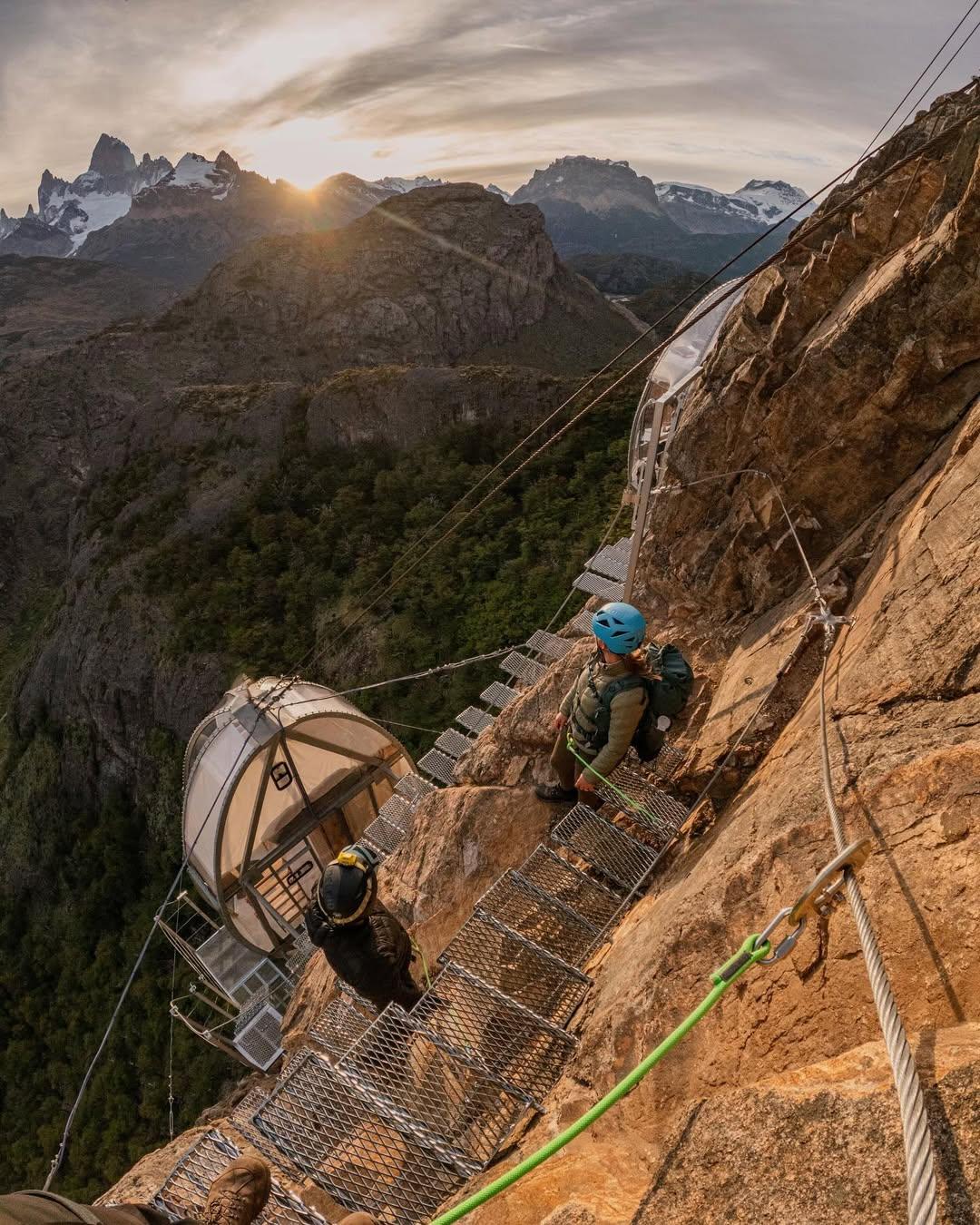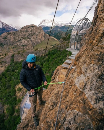 Еще одно приключение — путь к отелю. Гостей встречают в горной деревушке Эль-Чальтен в провинции Санта-Крус, откуда на внедорожниках везут к месту. После этого туристов ждет часовой поход по лесу к подножию скалы. Финальный этап — подъем по системе виа феррата (стальные лестницы и платформы) под присмотром гидов. Понятно, что засидеться в баре при таком подходе к номеру вряд ли получится.