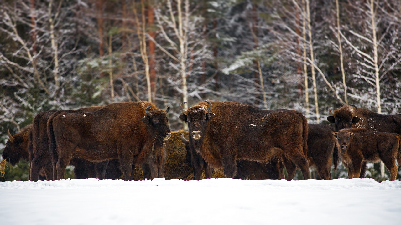 Егеря отмечают, что животные уже привыкли к графику подвоза пищи и по звуку транспорта понимают, что кормушки скоро будут наполнены. Во время одной из таких поездок в лесу удалось наблюдать стадо зубров, которое, заметив людей, скрылось в лесном массиве.