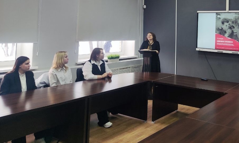 — Кинооператоры — отважные летописцы тех тяжёлых дней. Они снимали на передовой, рискуя жизнью. За 1418 дней войны кинооператоры создали 3,5 миллиона метров киноплёнки, более 500 выпусков киножурналов и 101 документальный фильм. Их работы наполнены патриотизмом и верой в победу, — рассказала студентам заместитель заведующей отделом научно-просветительской работы Татьяна Костригина.