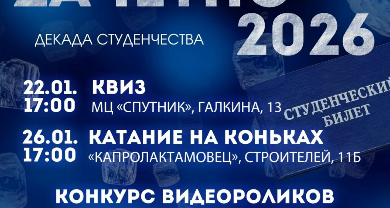 Второй этап запланирован на понедельник, 26 января, и предполагает катание на коньках на открытом катке спортивного комплекса "Капролактамовец". Заранее зарегистрироваться на этот этап также обязательно. Участникам рекомендуется принести с собой собственные коньки, а также студенческий билет, зачетную книжку или паспорт (для девушек по имени Татьяна).