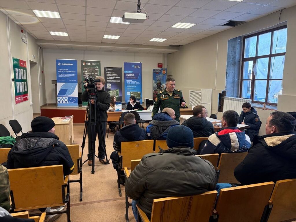 Инструктаж, знакомство с оружием и оказание первой медицинской помощи внимательно слушают добровольцы. Эти знания, уже через несколько месяцев могут спасти и им самим, и боевым товарищам жизнь. Эта лекция в пункте отбора на военную службу — первоначальная, более углубленная подготовка начнется после отправки.