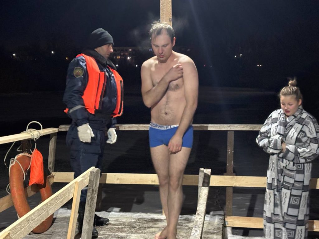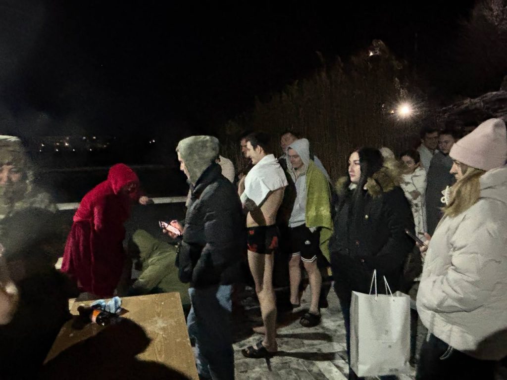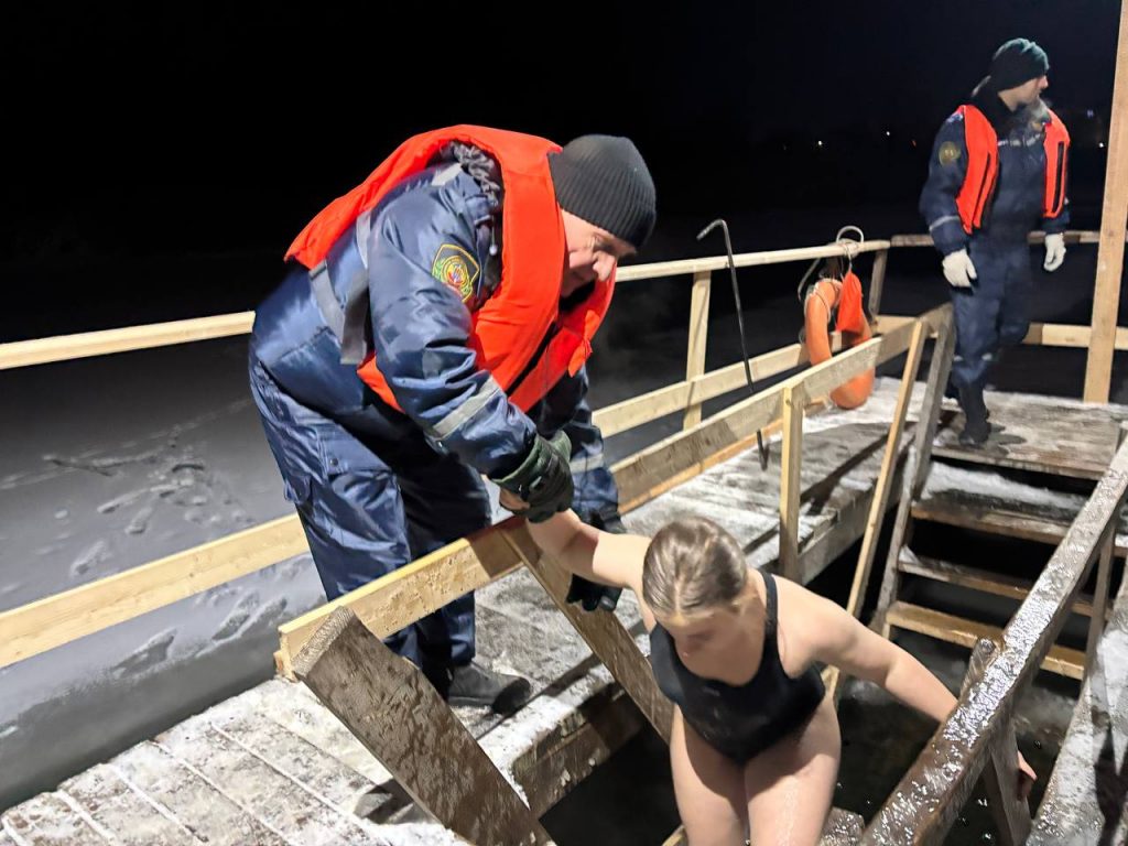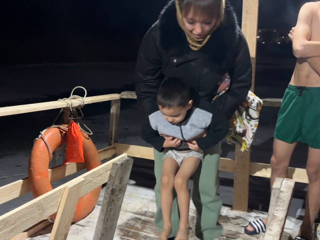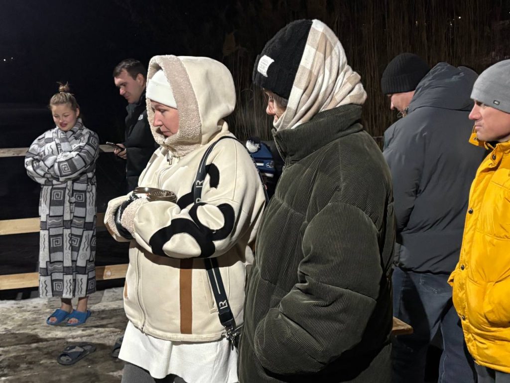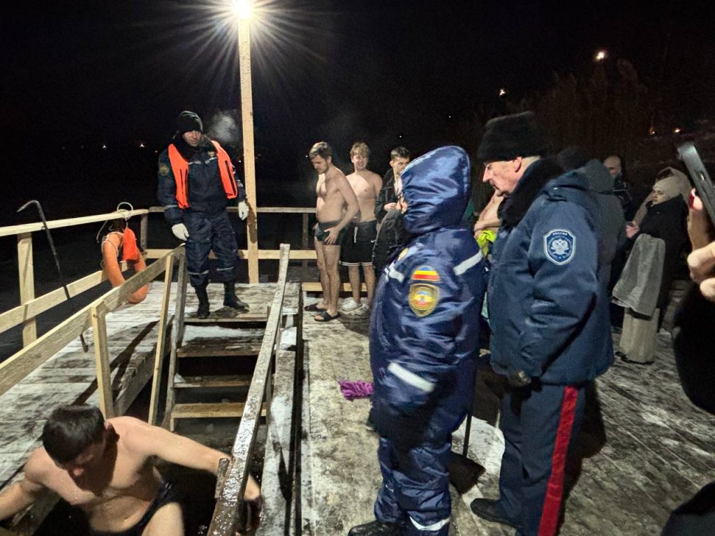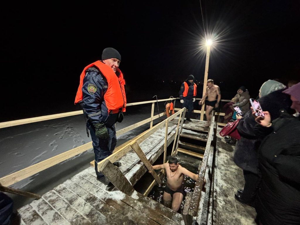 Несмотря на мороз, уже с 10 вечера к купели выстроилась очередь. Среди желающих окунуться, как мужчины, так и женщины. Участвуют в обрядовом купании и дети – малышам спасатели помогают окунуть ноги и передают в руки родителям.